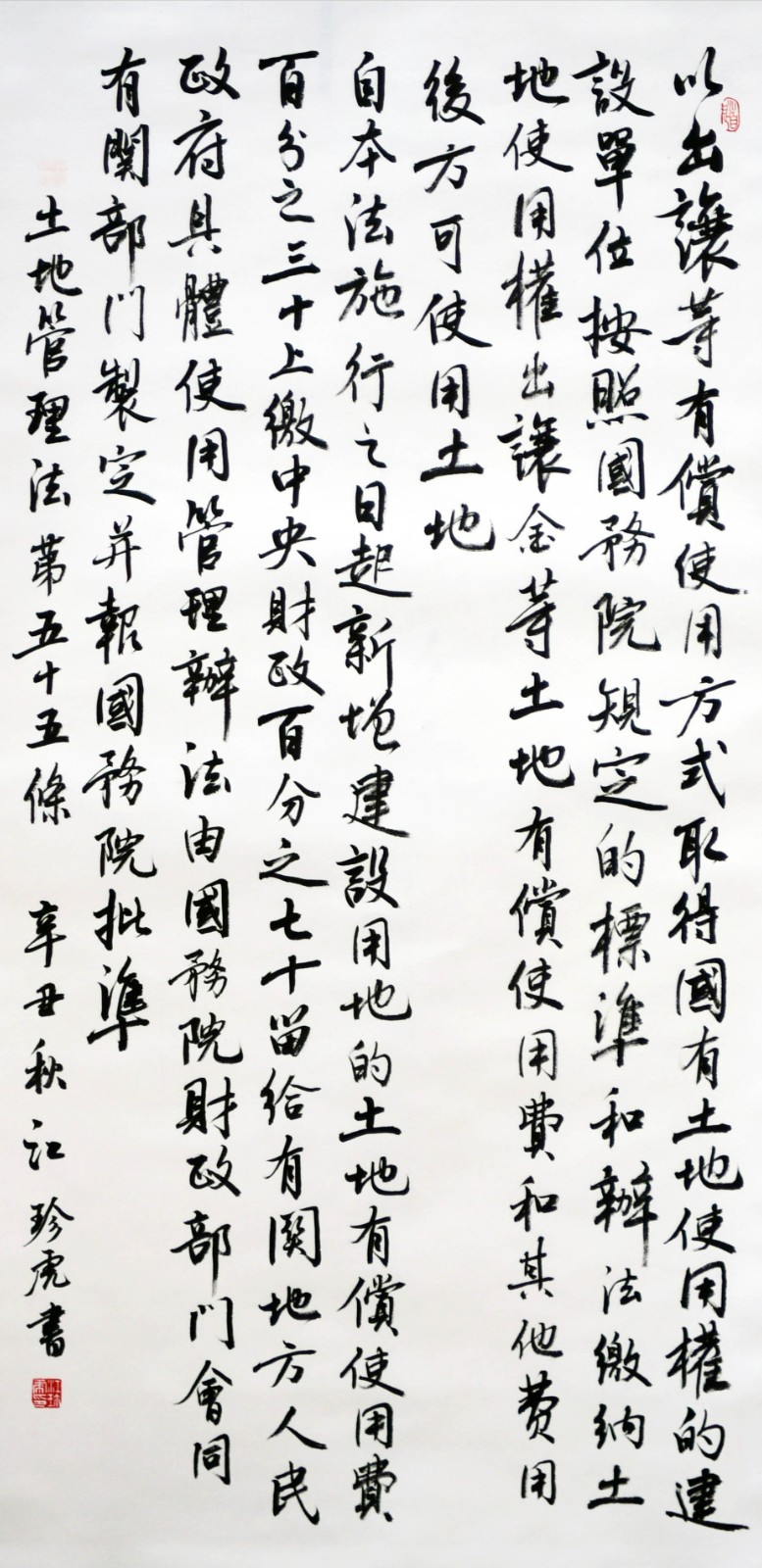 繼1600余位書法家參與書寫《中華人民共和國民法典》全部1260條法條之后,法治日?qǐng)?bào)社聯(lián)合自然資源部法規(guī)司、自然資源部書畫研究會(huì)和北京昌平書法家協(xié)會(huì),將筆端對(duì)準(zhǔn)土地管理“一法一條例”,即《中華人民共和國土地管理法》和《中華人民共和國土地管理法實(shí)施條例》。