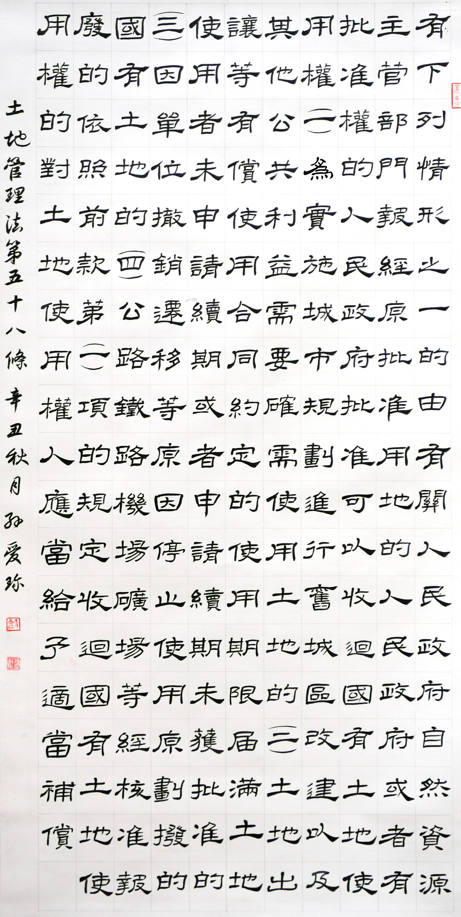 繼1600余位書法家參與書寫《中華人民共和國民法典》全部1260條法條之后,法治日報(bào)社聯(lián)合自然資源部法規(guī)司、自然資源部書畫研究會(huì)和北京昌平書法家協(xié)會(huì),將筆端對準(zhǔn)土地管理“一法一條例”,即《中華人民共和國土地管理法》和《中華人民共和國土地管理法實(shí)施條例》。