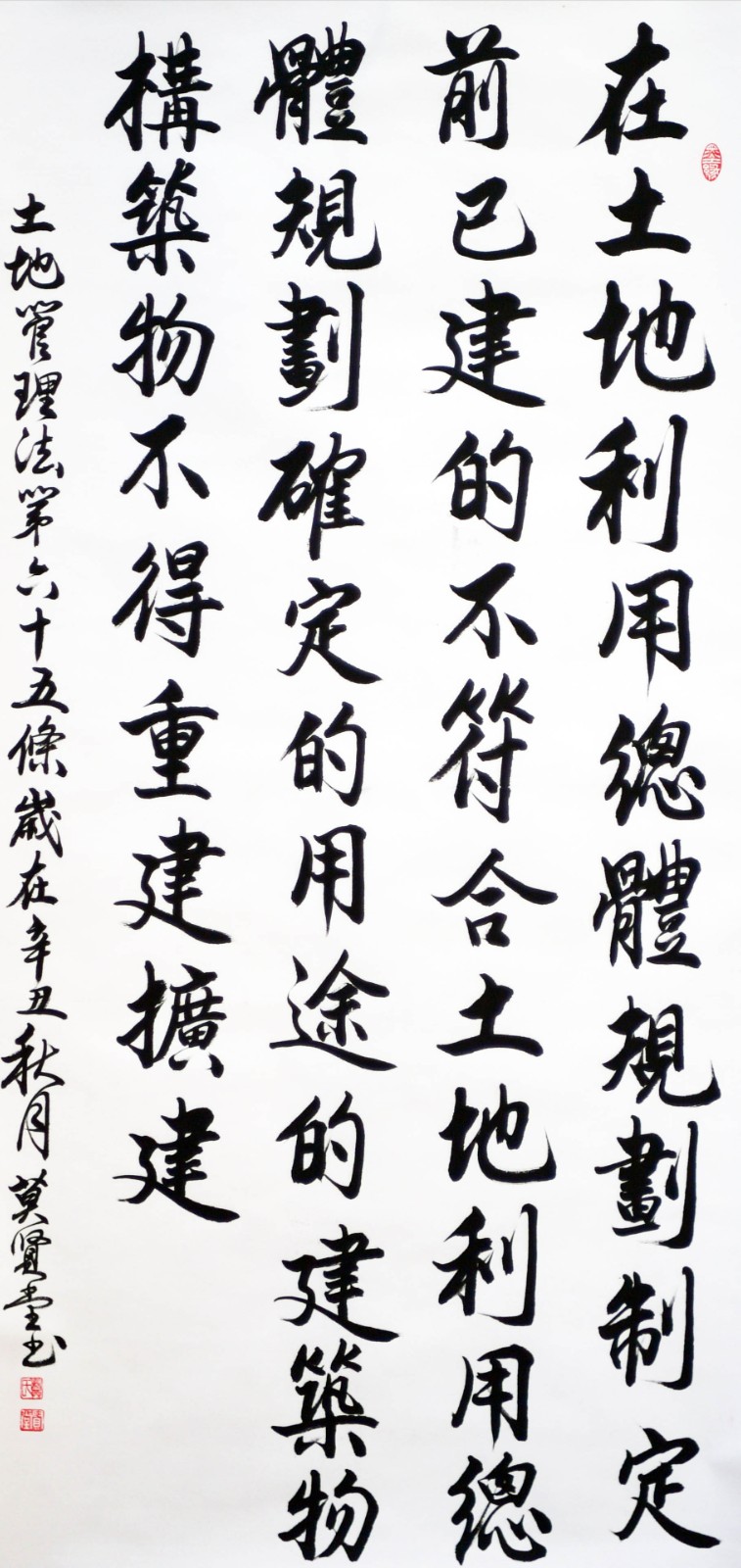繼1600余位書法家參與書寫《中華人民共和國民法典》全部1260條法條之后,法治日報(bào)社聯(lián)合自然資源部法規(guī)司、自然資源部書畫研究會和北京昌平書法家協(xié)會,將筆端對準(zhǔn)土地管理“一法一條例”,即《中華人民共和國土地管理法》和《中華人民共和國土地管理法實(shí)施條例》。