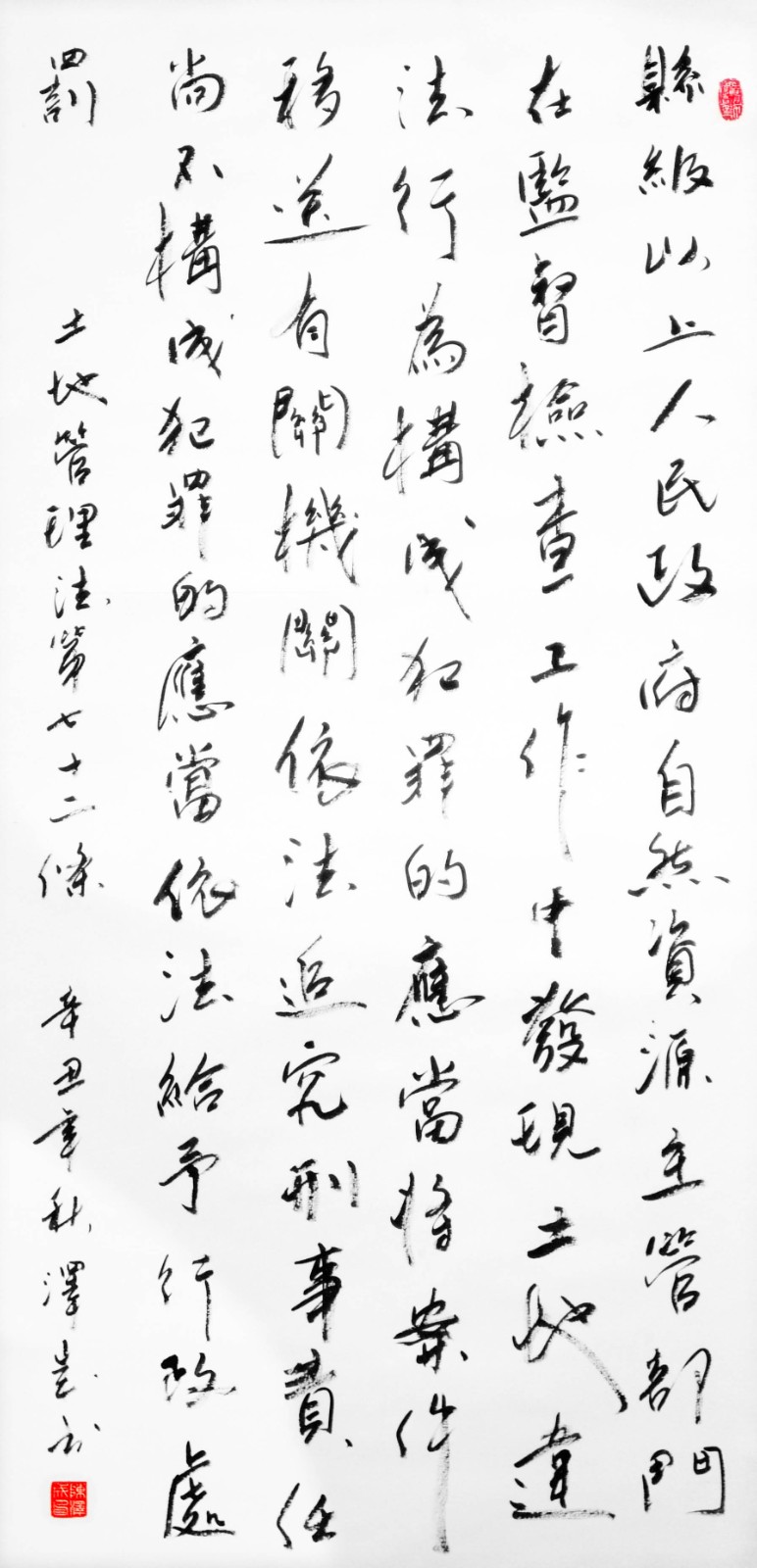 繼1600余位書法家參與書寫《中華人民共和國(guó)民法典》全部1260條法條之后,法治日?qǐng)?bào)社聯(lián)合自然資源部法規(guī)司、自然資源部書畫研究會(huì)和北京昌平書法家協(xié)會(huì),將筆端對(duì)準(zhǔn)土地管理“一法一條例”,即《中華人民共和國(guó)土地管理法》和《中華人民共和國(guó)土地管理法實(shí)施條例》。