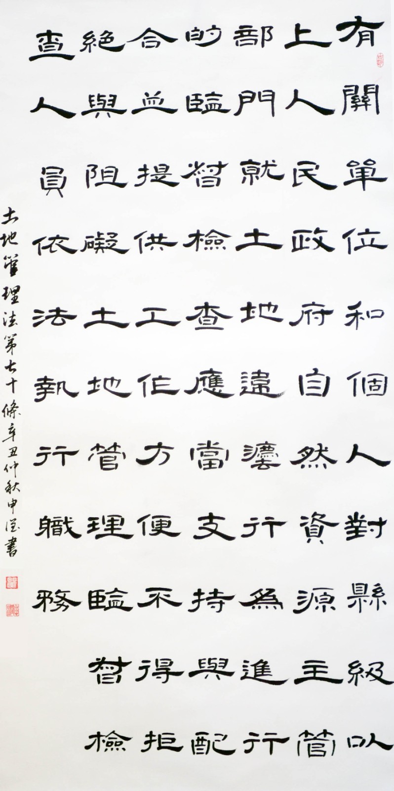 繼1600余位書法家參與書寫《中華人民共和國民法典》全部1260條法條之后,法治日報社聯(lián)合自然資源部法規(guī)司、自然資源部書畫研究會和北京昌平書法家協(xié)會,將筆端對準(zhǔn)土地管理“一法一條例”,即《中華人民共和國土地管理法》和《中華人民共和國土地管理法實施條例》。