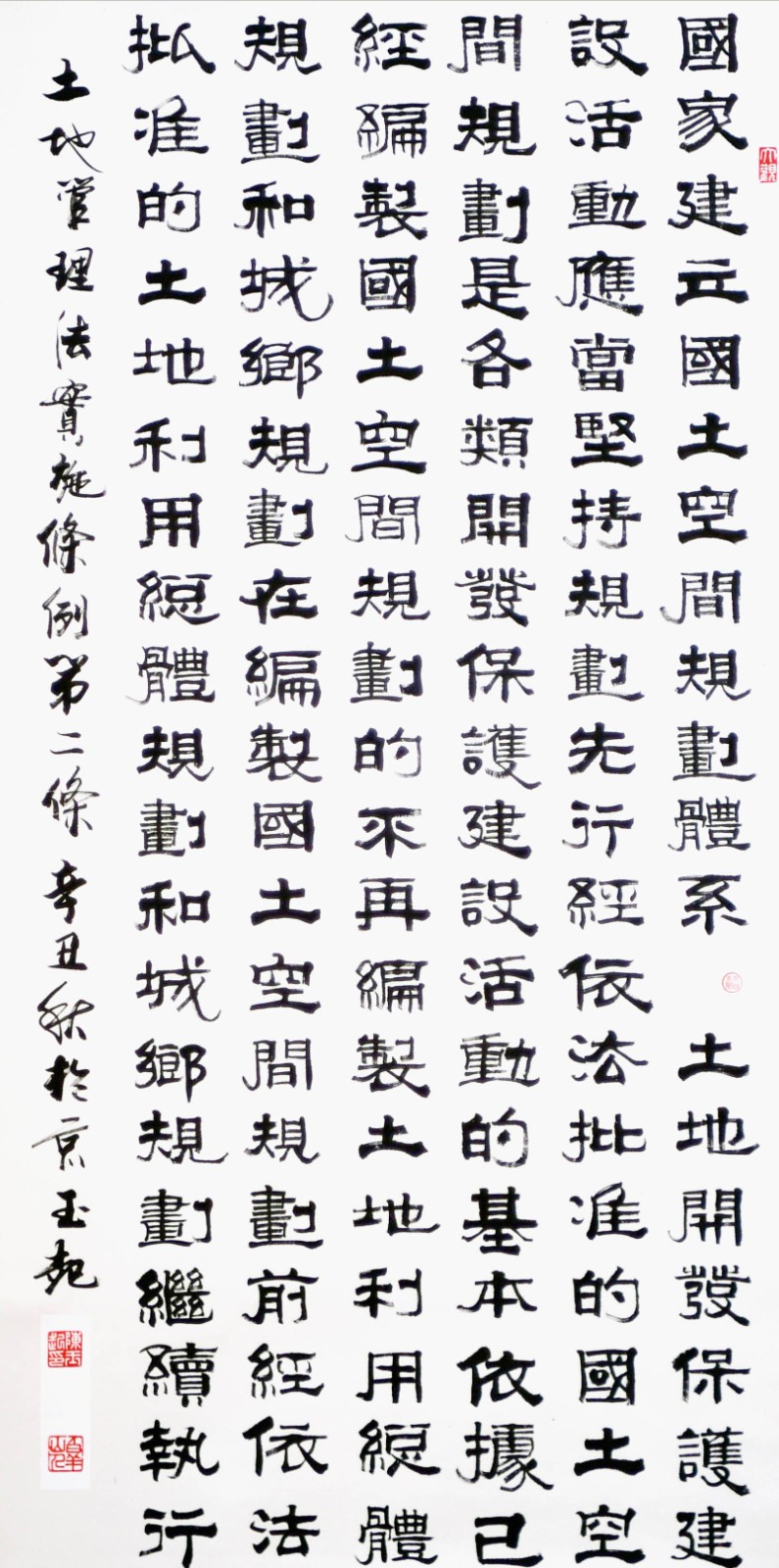 繼1600余位書法家參與書寫《中華人民共和國民法典》全部1260條法條之后,法治日報社聯(lián)合自然資源部法規(guī)司、自然資源部書畫研究會和北京昌平書法家協(xié)會,將筆端對準(zhǔn)土地管理“一法一條例”,即《中華人民共和國土地管理法》和《中華人民共和國土地管理法實(shí)施條例》。