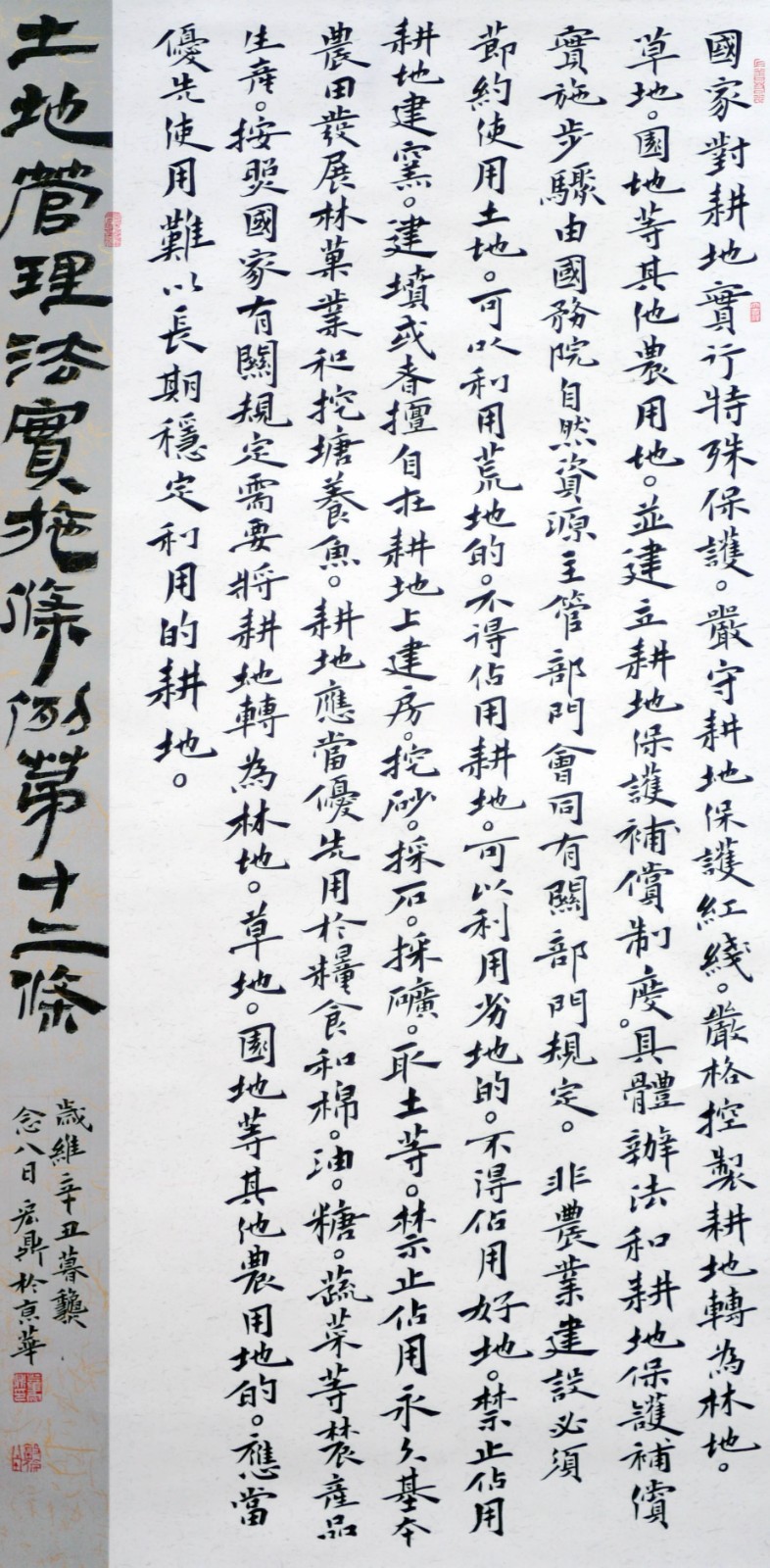 繼1600余位書法家參與書寫《中華人民共和國民法典》全部1260條法條之后,法治日?qǐng)?bào)社聯(lián)合自然資源部法規(guī)司、自然資源部書畫研究會(huì)和北京昌平書法家協(xié)會(huì),將筆端對(duì)準(zhǔn)土地管理“一法一條例”,即《中華人民共和國土地管理法》和《中華人民共和國土地管理法實(shí)施條例》。