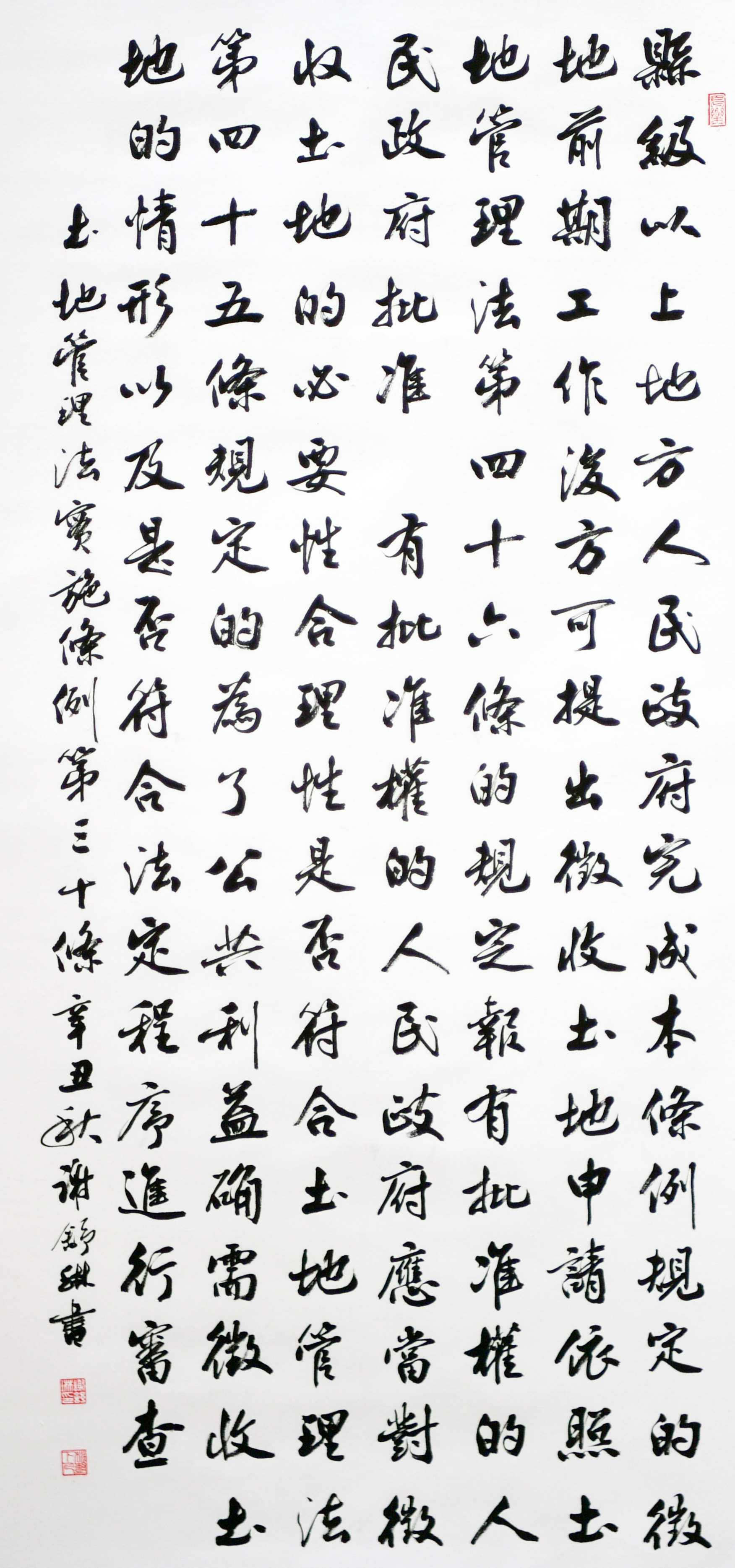 繼1600余位書法家參與書寫《中華人民共和國(guó)民法典》全部1260條法條之后,法治日?qǐng)?bào)社聯(lián)合自然資源部法規(guī)司、自然資源部書畫研究會(huì)和北京昌平書法家協(xié)會(huì),將筆端對(duì)準(zhǔn)土地管理“一法一條例”,即《中華人民共和國(guó)土地管理法》和《中華人民共和國(guó)土地管理法實(shí)施條例》。
