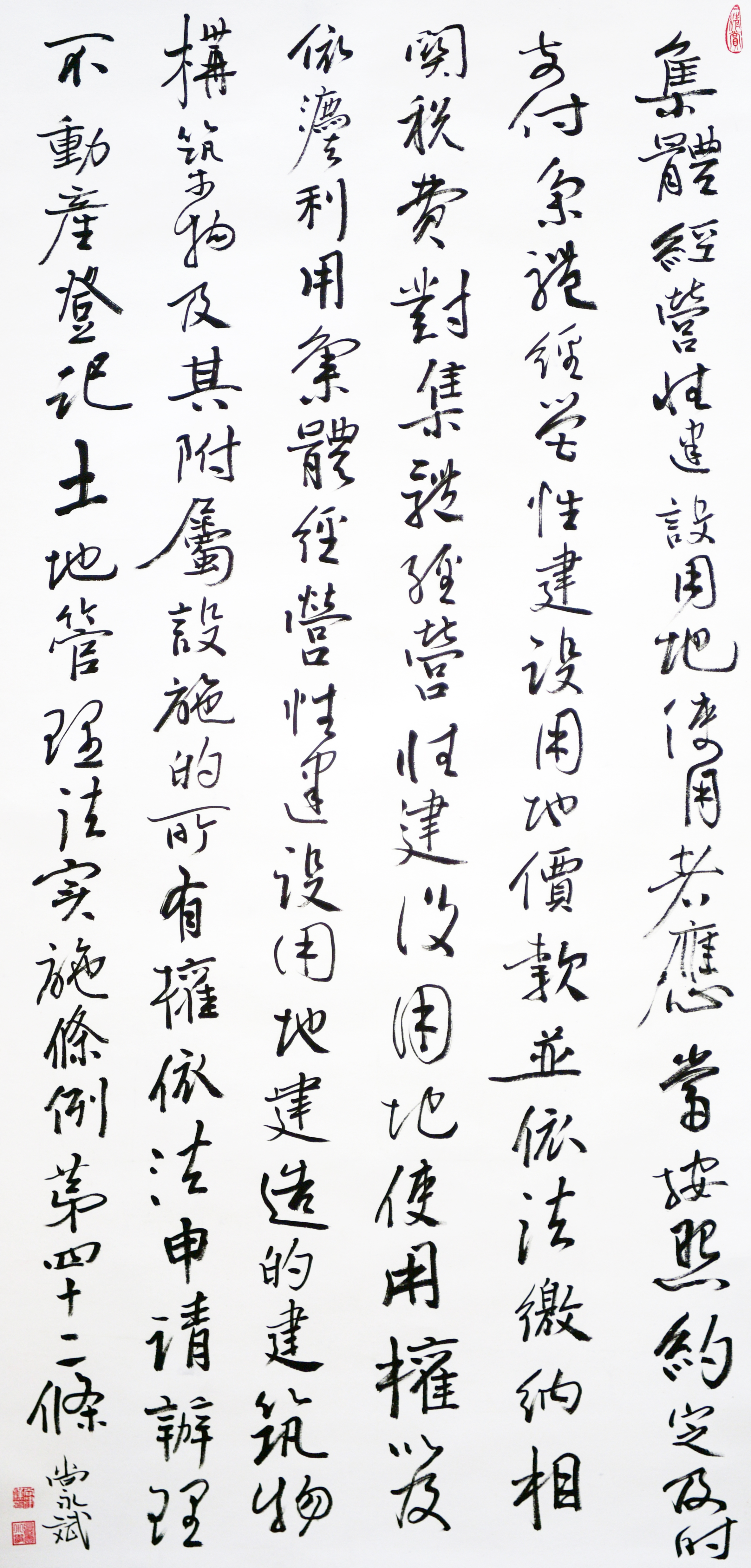 繼1600余位書法家參與書寫《中華人民共和國民法典》全部1260條法條之后,法治日報(bào)社聯(lián)合自然資源部法規(guī)司、自然資源部書畫研究會和北京昌平書法家協(xié)會,將筆端對準(zhǔn)土地管理“一法一條例”,即《中華人民共和國土地管理法》和《中華人民共和國土地管理法實(shí)施條例》。