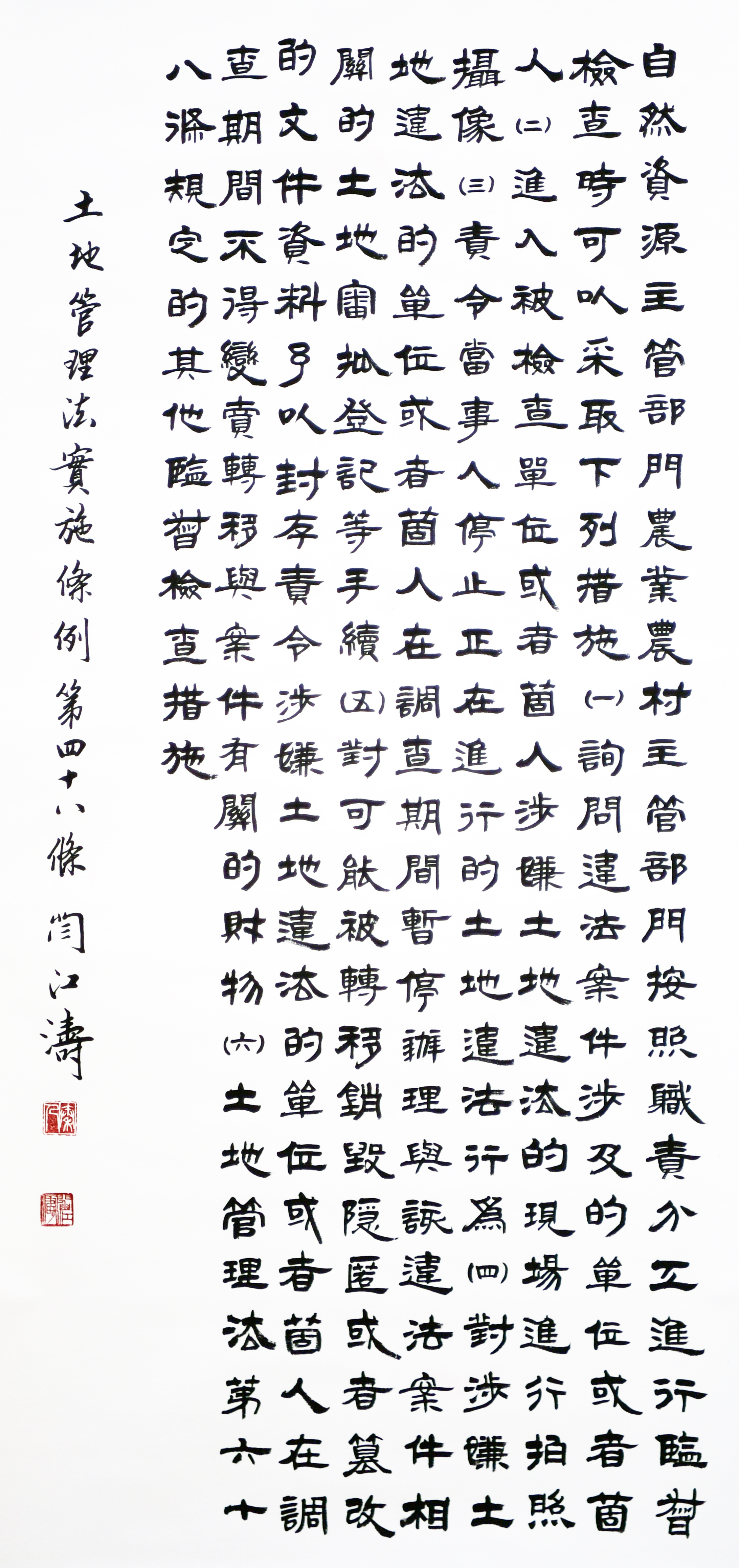 繼1600余位書法家參與書寫《中華人民共和國民法典》全部1260條法條之后,法治日報(bào)社聯(lián)合自然資源部法規(guī)司、自然資源部書畫研究會(huì)和北京昌平書法家協(xié)會(huì),將筆端對準(zhǔn)土地管理“一法一條例”,即《中華人民共和國土地管理法》和《中華人民共和國土地管理法實(shí)施條例》。
