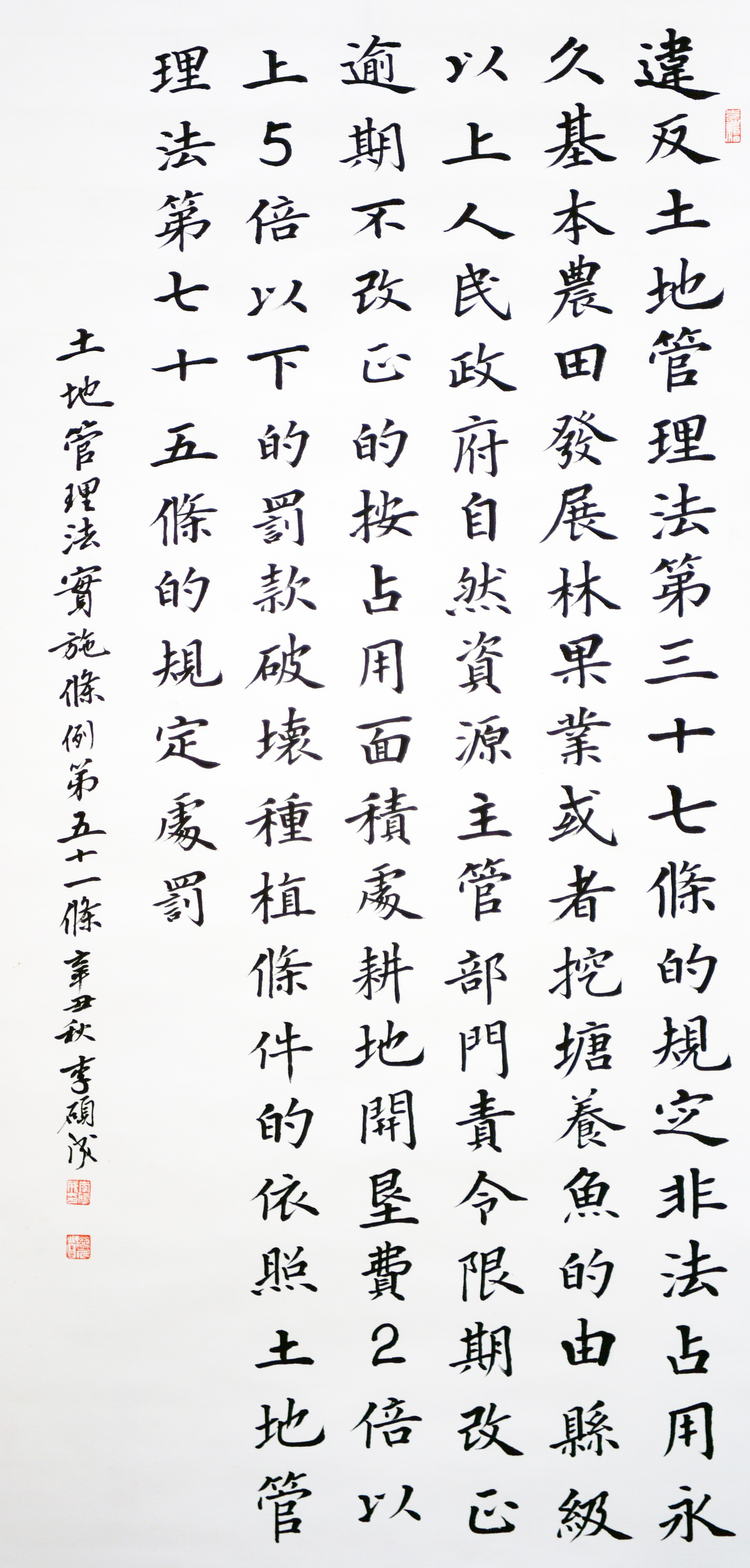 繼1600余位書(shū)法家參與書(shū)寫(xiě)《中華人民共和國(guó)民法典》全部1260條法條之后,法治日?qǐng)?bào)社聯(lián)合自然資源部法規(guī)司、自然資源部書(shū)畫(huà)研究會(huì)和北京昌平書(shū)法家協(xié)會(huì),將筆端對(duì)準(zhǔn)土地管理“一法一條例”,即《中華人民共和國(guó)土地管理法》和《中華人民共和國(guó)土地管理法實(shí)施條例》。