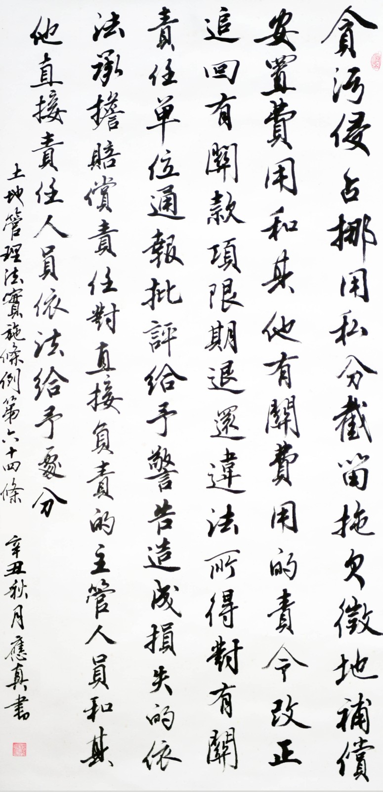 繼1600余位書法家參與書寫《中華人民共和國民法典》全部1260條法條之后,法治日?qǐng)?bào)社聯(lián)合自然資源部法規(guī)司、自然資源部書畫研究會(huì)和北京昌平書法家協(xié)會(huì),將筆端對(duì)準(zhǔn)土地管理“一法一條例”,即《中華人民共和國土地管理法》和《中華人民共和國土地管理法實(shí)施條例》。