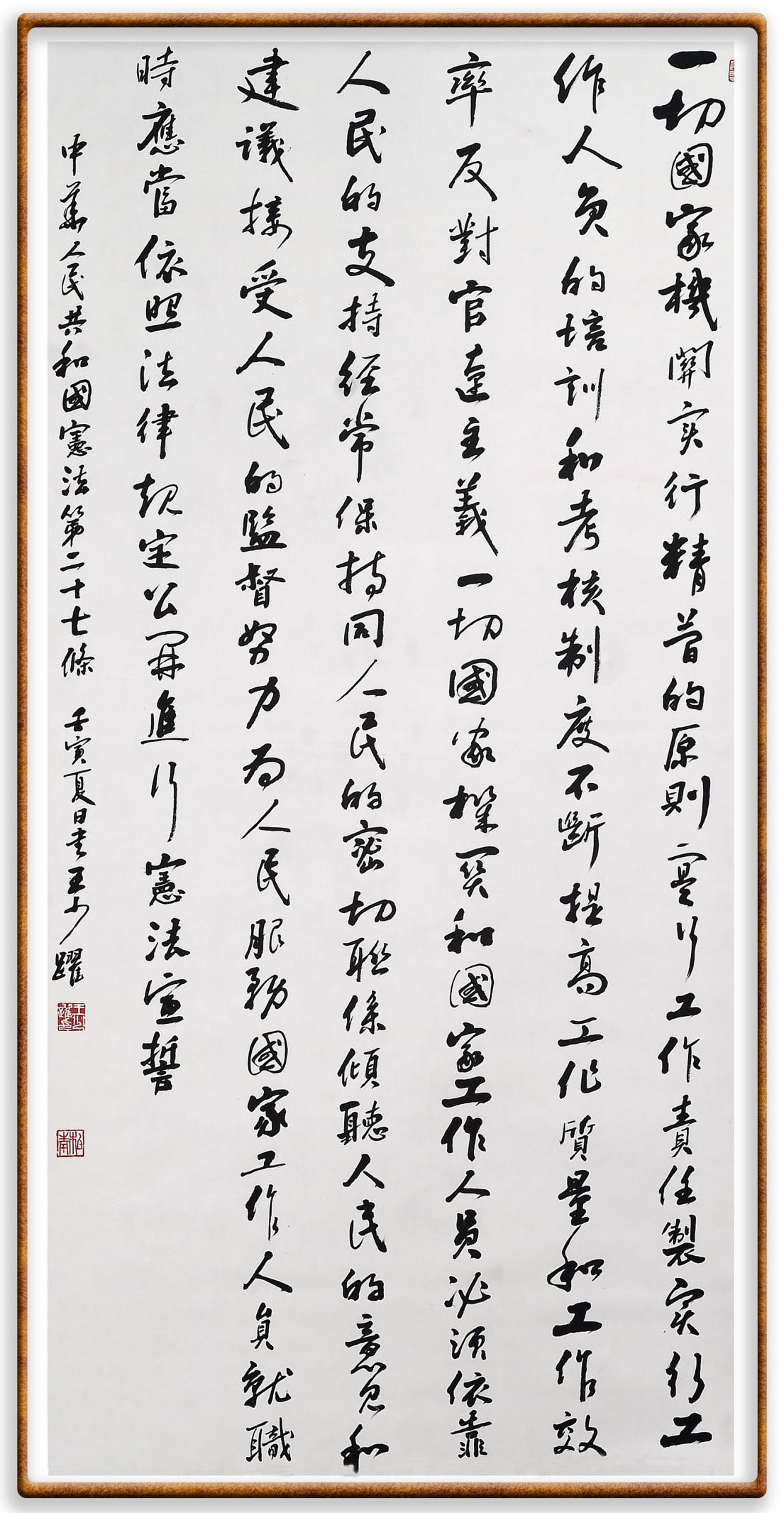 繼《中華人民共和國民法典》《中華人民共和國土地管理法》《中華人民共和國土地管理法實施條例》《中華人民共和國法律援助法》之后,法治日報社聯(lián)合北京市司法局、北京市書法家協(xié)會,將筆端對準(zhǔn)《中華人民共和國憲法》和《中華人民共和國行政處罰法》。