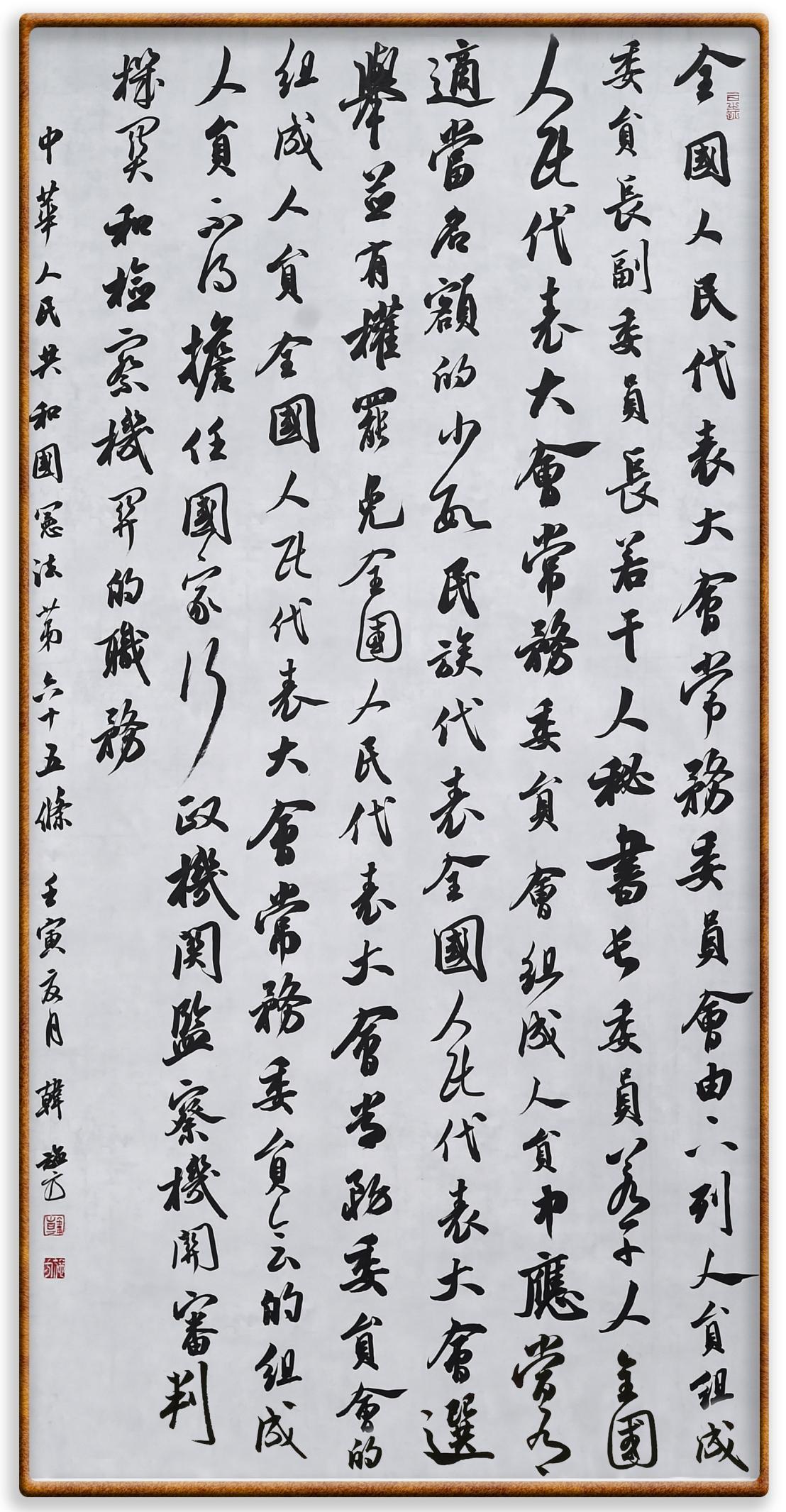 繼《中華人民共和國民法典》《中華人民共和國土地管理法》《中華人民共和國土地管理法實施條例》《中華人民共和國法律援助法》之后,法治日報社聯(lián)合北京市司法局、北京書法家協(xié)會,將筆端對準(zhǔn)《中華人民共和國憲法》和《中華人民共和國行政處罰法》。