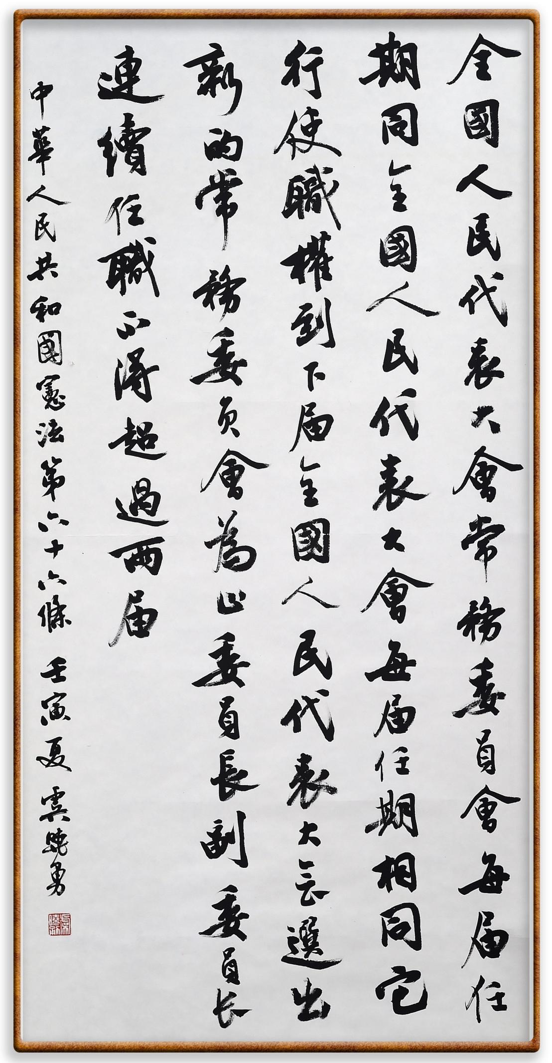 繼《中華人民共和國民法典》《中華人民共和國土地管理法》《中華人民共和國土地管理法實施條例》《中華人民共和國法律援助法》之后,法治日報社聯(lián)合北京市司法局、北京書法家協(xié)會,將筆端對準《中華人民共和國憲法》和《中華人民共和國行政處罰法》。