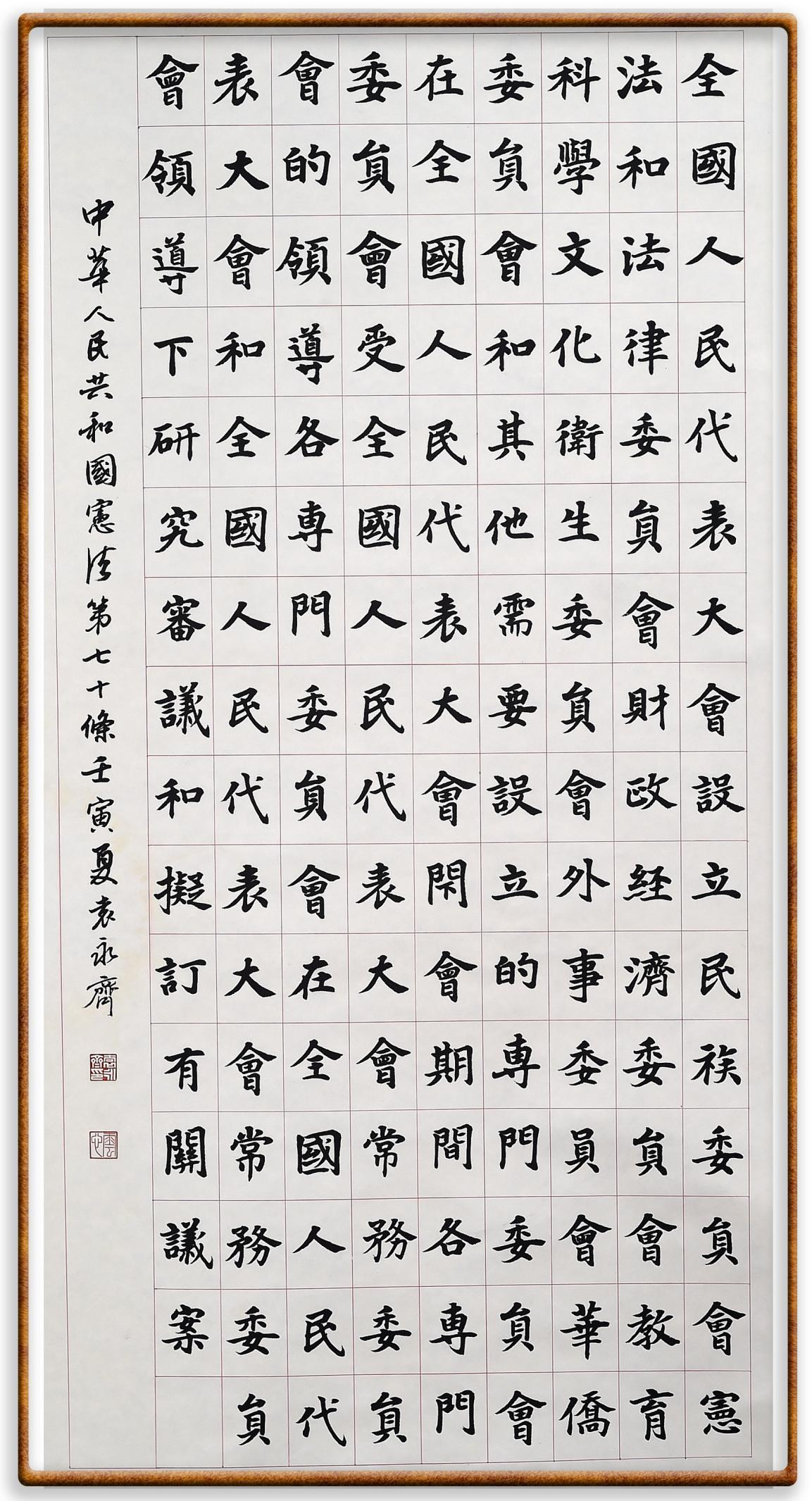 繼《中華人民共和國民法典》《中華人民共和國土地管理法》《中華人民共和國土地管理法實(shí)施條例》《中華人民共和國法律援助法》之后,法治日?qǐng)?bào)社聯(lián)合北京市司法局、北京書法家協(xié)會(huì),將筆端對(duì)準(zhǔn)《中華人民共和國憲法》和《中華人民共和國行政處罰法》。