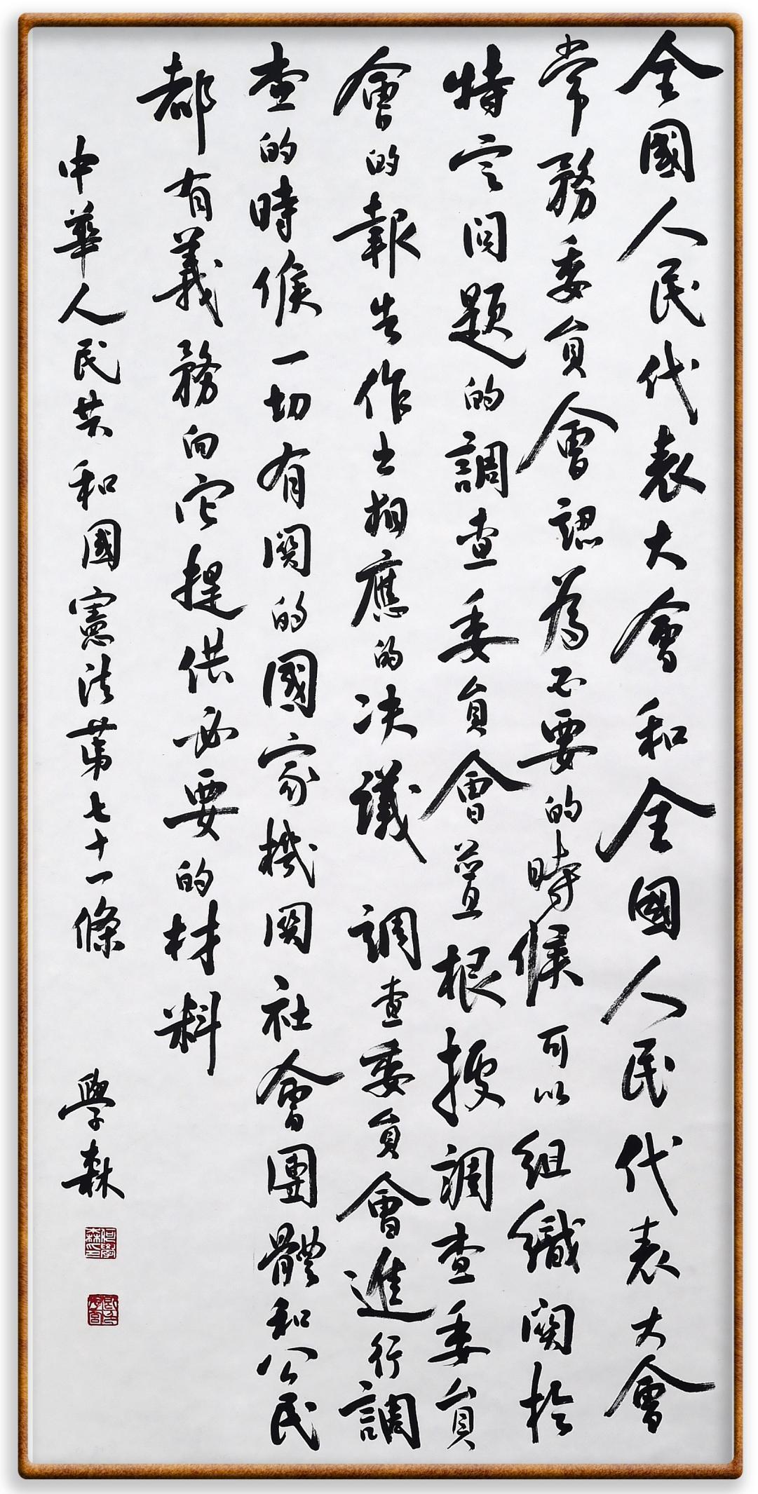 繼《中華人民共和國民法典》《中華人民共和國土地管理法》《中華人民共和國土地管理法實(shí)施條例》《中華人民共和國法律援助法》之后,法治日?qǐng)?bào)社聯(lián)合北京市司法局、北京書法家協(xié)會(huì),將筆端對(duì)準(zhǔn)《中華人民共和國憲法》和《中華人民共和國行政處罰法》。