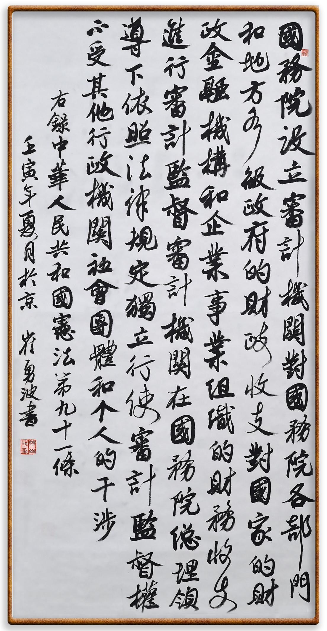 繼《中華人民共和國民法典》《中華人民共和國土地管理法》《中華人民共和國土地管理法實施條例》《中華人民共和國法律援助法》之后,法治日報社聯(lián)合北京市司法局、北京書法家協(xié)會,將筆端對準《中華人民共和國憲法》和《中華人民共和國行政處罰法》。