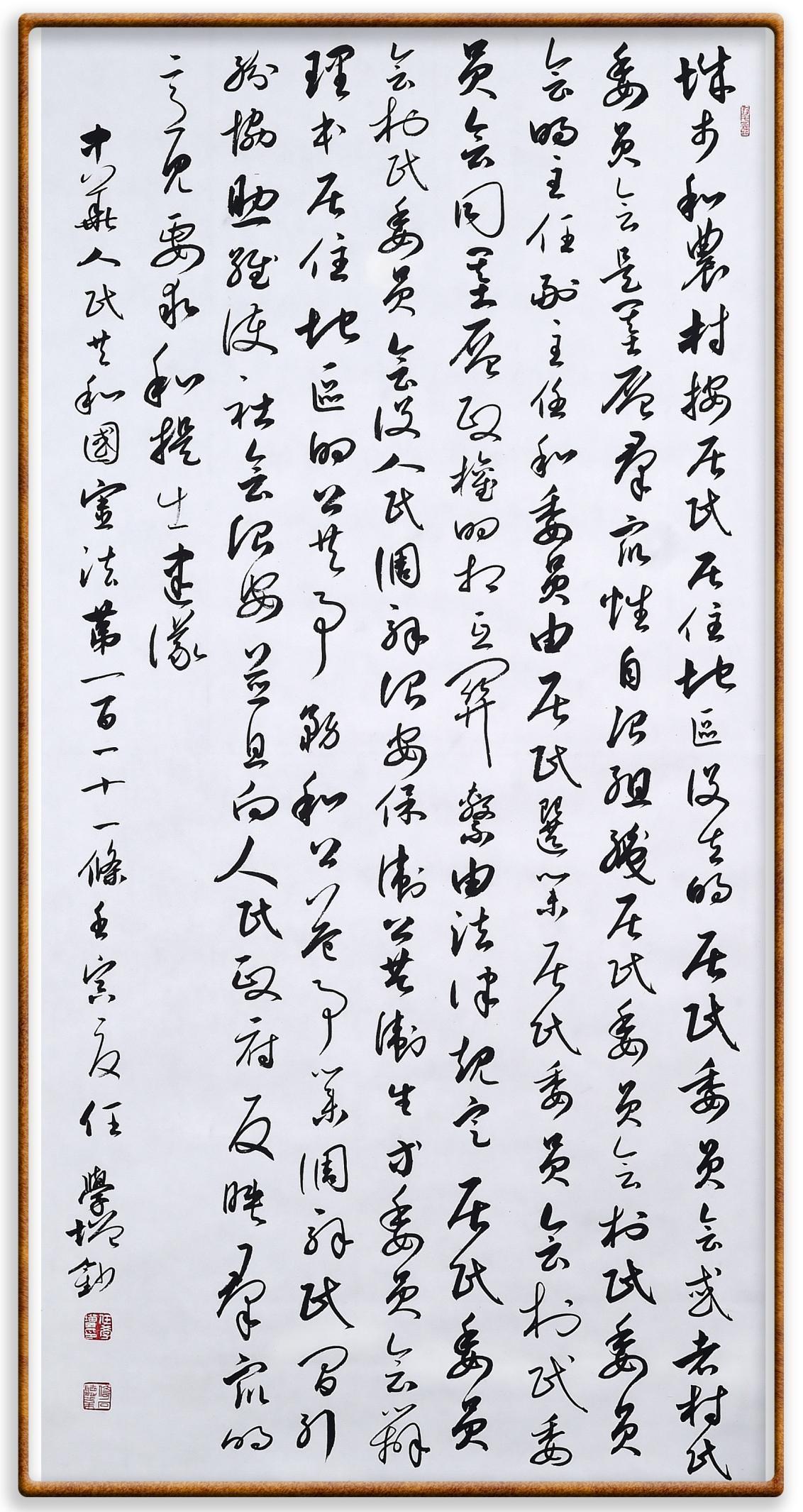 繼《中華人民共和國(guó)民法典》《中華人民共和國(guó)土地管理法》《中華人民共和國(guó)土地管理法實(shí)施條例》《中華人民共和國(guó)法律援助法》之后,法治日?qǐng)?bào)社聯(lián)合北京市司法局、北京書(shū)法家協(xié)會(huì),將筆端對(duì)準(zhǔn)《中華人民共和國(guó)憲法》和《中華人民共和國(guó)行政處罰法》。
