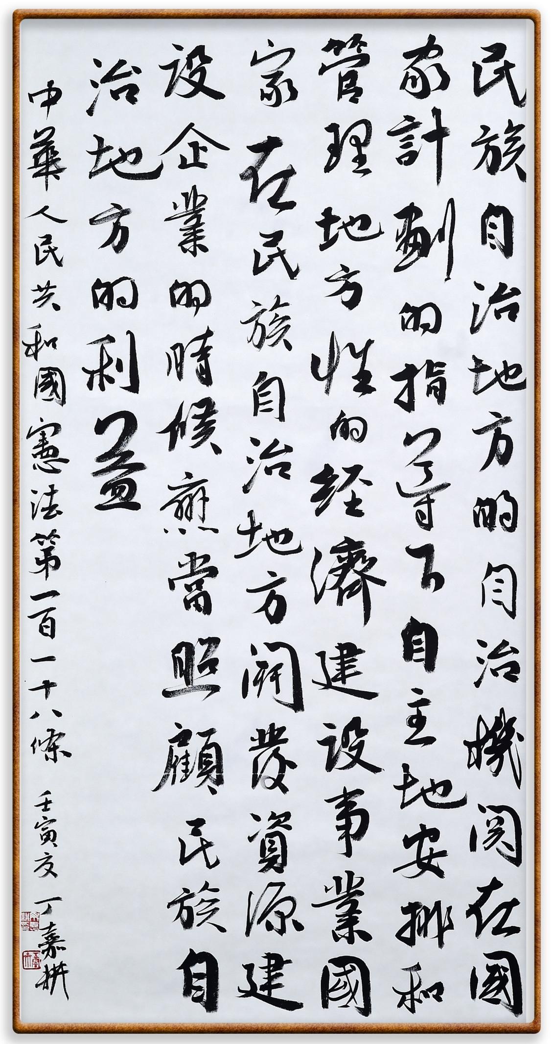 繼《中華人民共和國民法典》《中華人民共和國土地管理法》《中華人民共和國土地管理法實(shí)施條例》《中華人民共和國法律援助法》之后,法治日?qǐng)?bào)社聯(lián)合北京市司法局、北京書法家協(xié)會(huì),將筆端對(duì)準(zhǔn)《中華人民共和國憲法》和《中華人民共和國行政處罰法》。