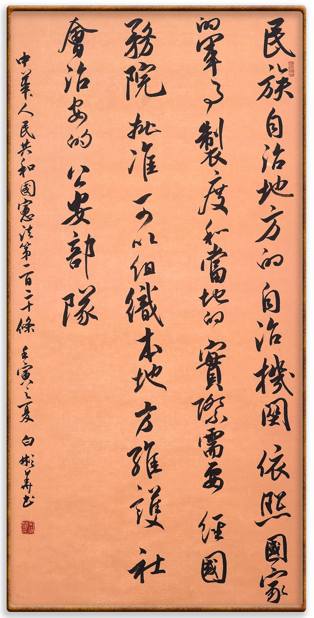 繼《中華人民共和國(guó)民法典》《中華人民共和國(guó)土地管理法》《中華人民共和國(guó)土地管理法實(shí)施條例》《中華人民共和國(guó)法律援助法》之后,法治日?qǐng)?bào)社聯(lián)合北京市司法局、北京書(shū)法家協(xié)會(huì),將筆端對(duì)準(zhǔn)《中華人民共和國(guó)憲法》和《中華人民共和國(guó)行政處罰法》。