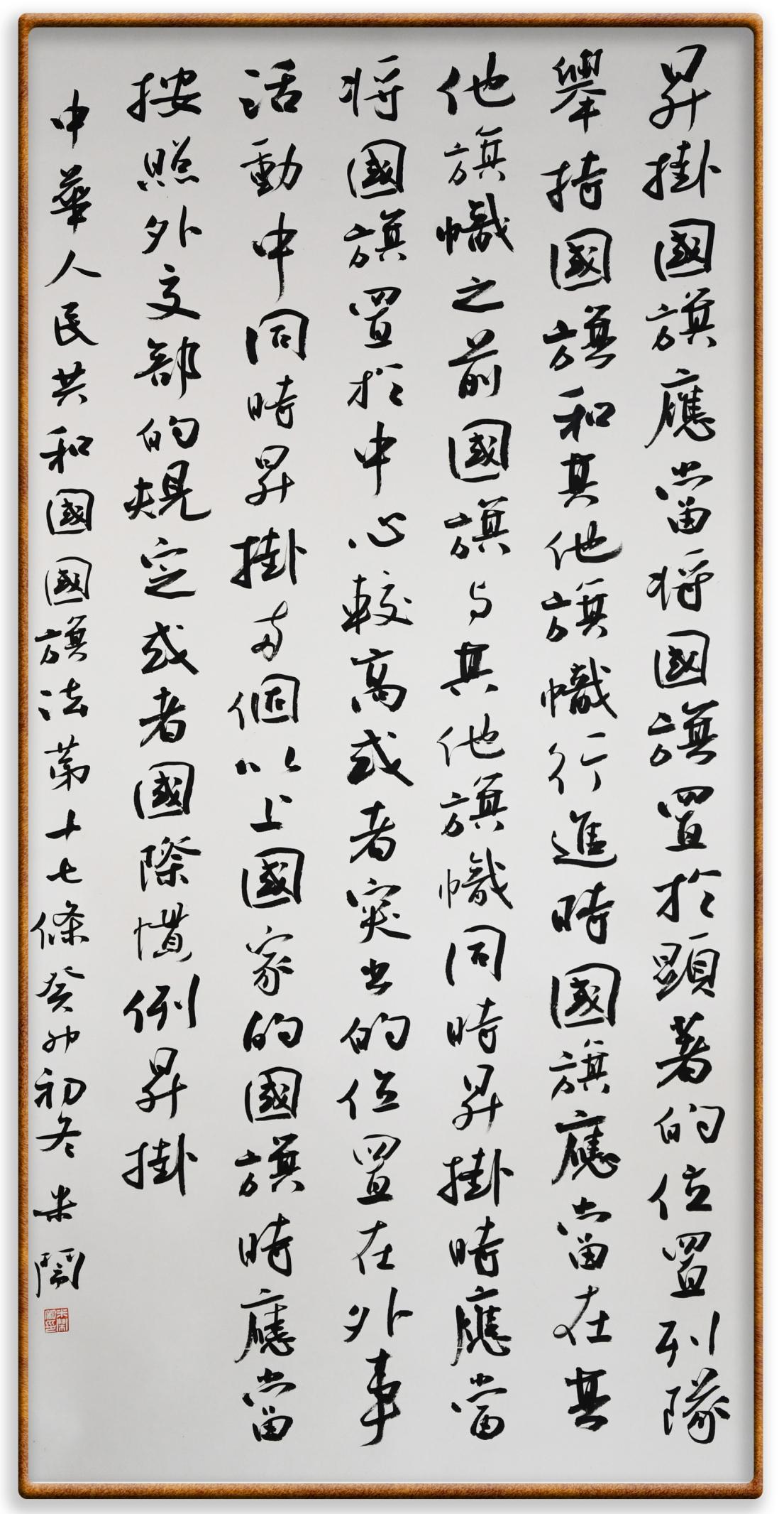 國(guó)旗與其他旗幟同時(shí)升掛時(shí),應(yīng)當(dāng)將國(guó)旗置于中心、較高或者突出的位置。
