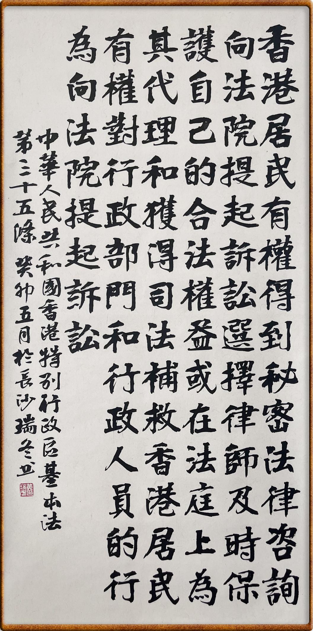 香港基本法第三十五條 香港居民有權得到秘密法律咨詢、向法院提起訴訟、選擇律師及時保護自己的合法權益或在法庭上為其代理和獲得司法補救。