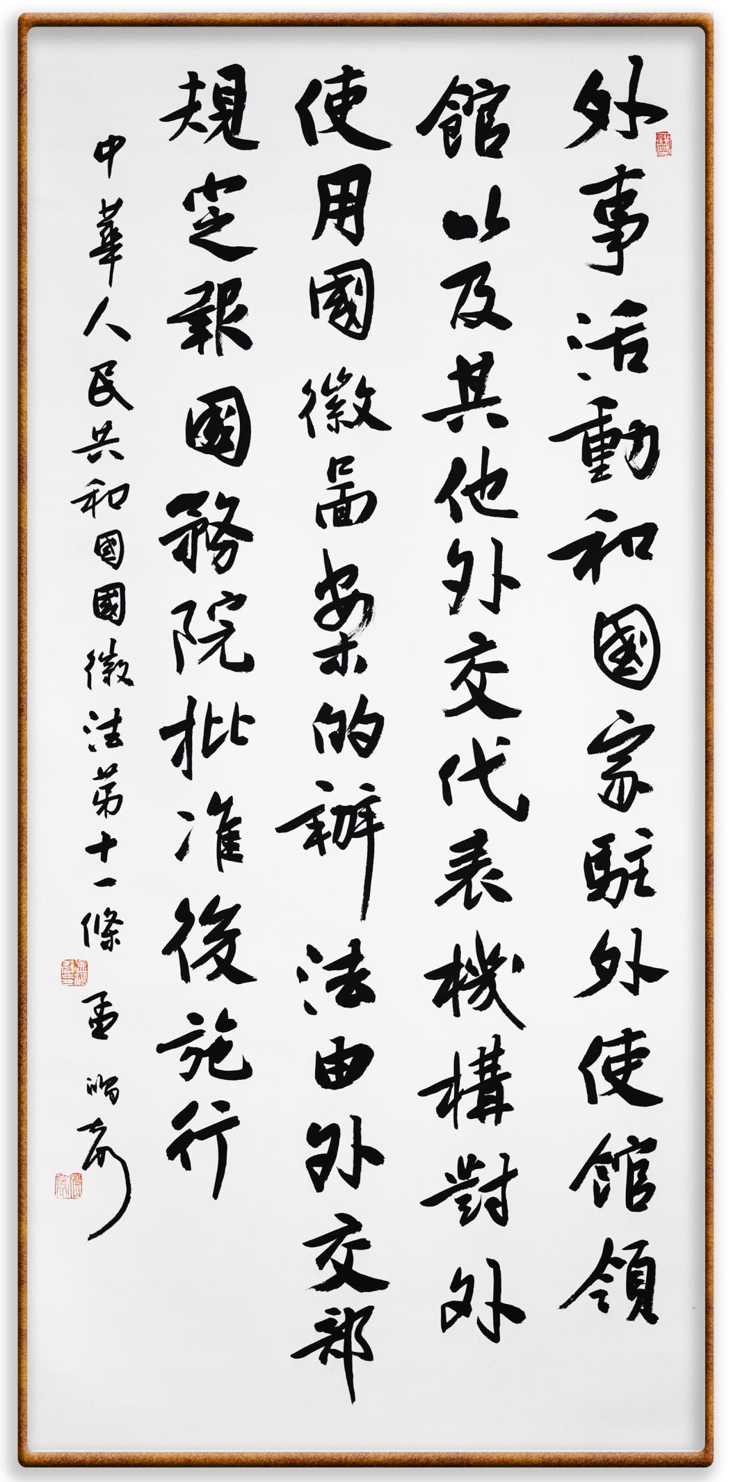國徽法第十一條 外事活動和國家駐外使館、領(lǐng)館以及其他外交代表機構(gòu)對外使用國徽圖案的辦法,由外交部規(guī)定,報國務院批準后施行。