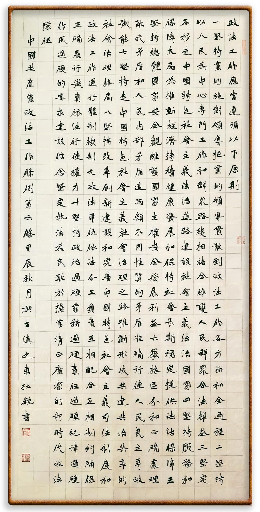 《中國共產(chǎn)黨政法工作條例》對黨領(lǐng)導(dǎo)新時(shí)代政法工作進(jìn)行全面制度擘畫,為黨領(lǐng)導(dǎo)政法工作提供基本遵循,具有重大而深遠(yuǎn)的意義。為學(xué)習(xí)好、宣傳好、貫徹好、實(shí)施好這部黨內(nèi)法規(guī),繼《中華人民共和國民法典》《中華人民共和國憲法》《信訪工作條例》《中華人民共和國澳門特別行政區(qū)基本法》《中華人民共和國香港特別行政區(qū)基本法》等法律法規(guī)之后,“書·法”系列活動(dòng)將筆端對準(zhǔn)《中國共產(chǎn)黨政法工作條例》。