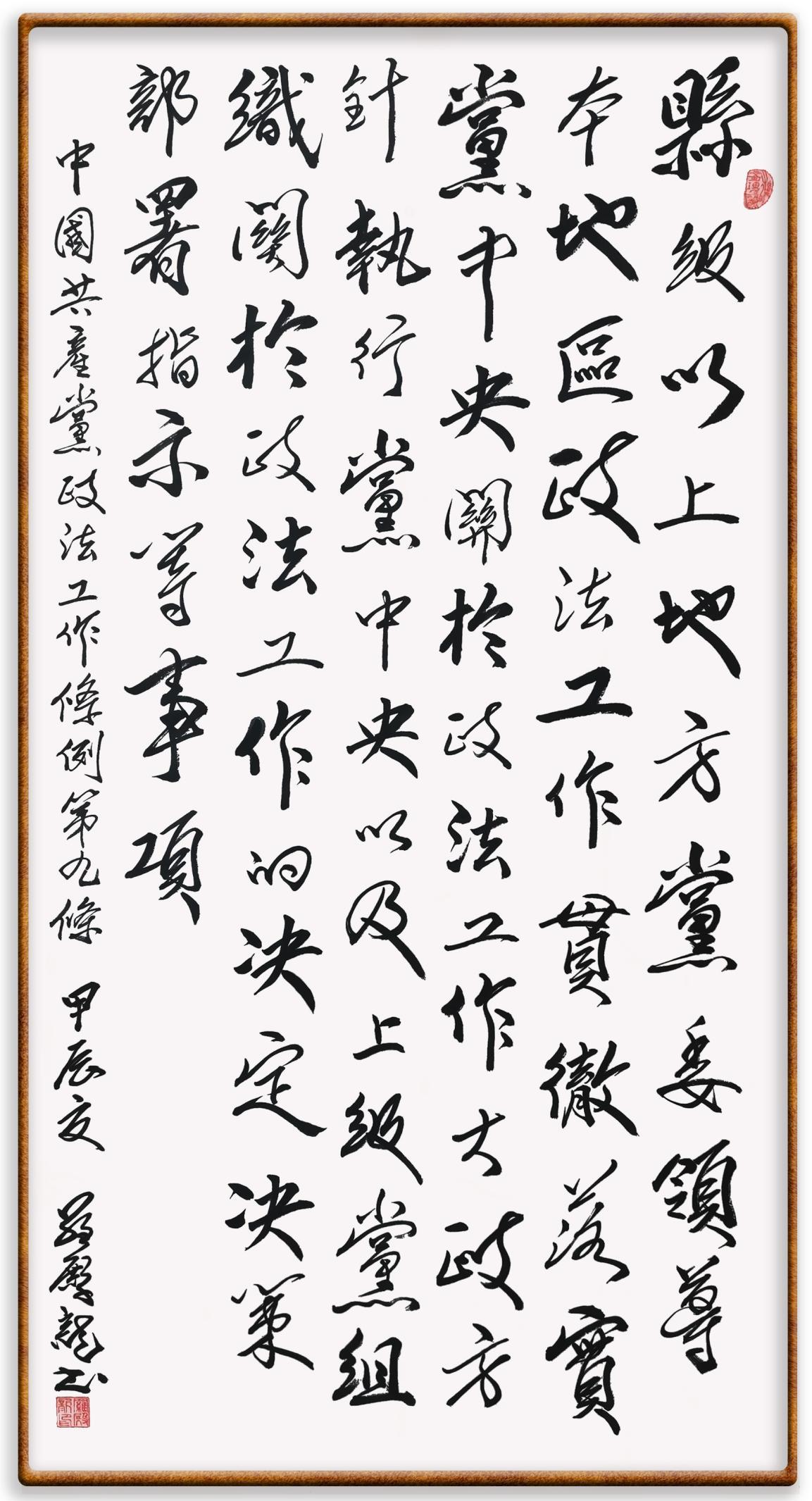 《中國(guó)共產(chǎn)黨政法工作條例》對(duì)黨領(lǐng)導(dǎo)新時(shí)代政法工作進(jìn)行全面制度擘畫,為黨領(lǐng)導(dǎo)政法工作提供基本遵循,具有重大而深遠(yuǎn)的意義。為學(xué)習(xí)好、宣傳好、貫徹好、實(shí)施好這部黨內(nèi)法規(guī),繼《中華人民共和國(guó)民法典》《中華人民共和國(guó)憲法》《信訪工作條例》《中華人民共和國(guó)澳門特別行政區(qū)基本法》《中華人民共和國(guó)香港特別行政區(qū)基本法》等法律法規(guī)之后,“書·法”系列活動(dòng)將筆端對(duì)準(zhǔn)《中國(guó)共產(chǎn)黨政法工作條例》。