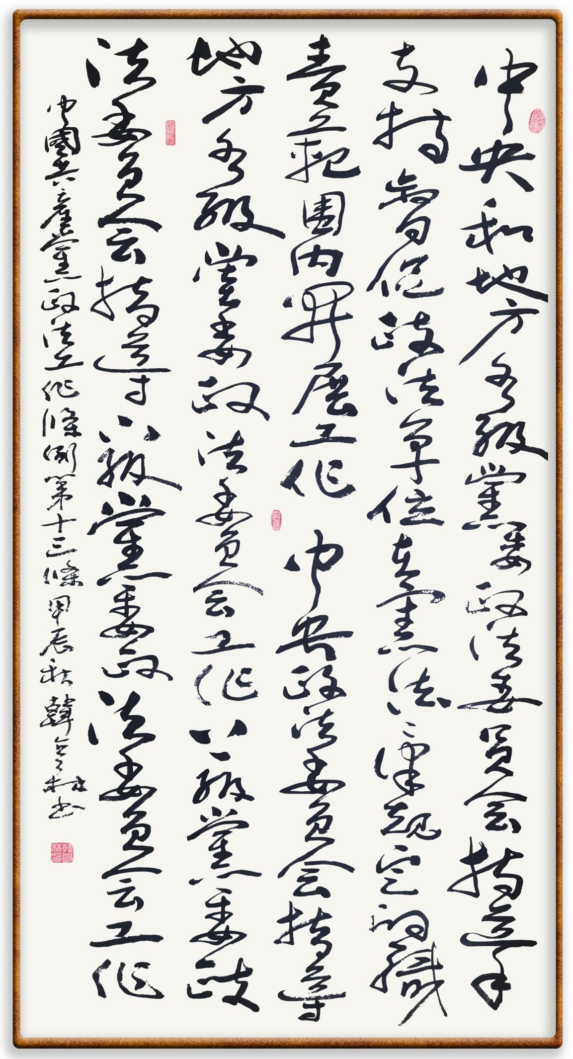 《中國共產(chǎn)黨政法工作條例》對黨領(lǐng)導(dǎo)新時代政法工作進行全面制度擘畫,為黨領(lǐng)導(dǎo)政法工作提供基本遵循,具有重大而深遠的意義。為學(xué)習(xí)好、宣傳好、貫徹好、實施好這部黨內(nèi)法規(guī),繼《中華人民共和國民法典》《中華人民共和國憲法》《信訪工作條例》《中華人民共和國澳門特別行政區(qū)基本法》《中華人民共和國香港特別行政區(qū)基本法》等法律法規(guī)之后,“書·法”系列活動將筆端對準(zhǔn)《中國共產(chǎn)黨政法工作條例》。
