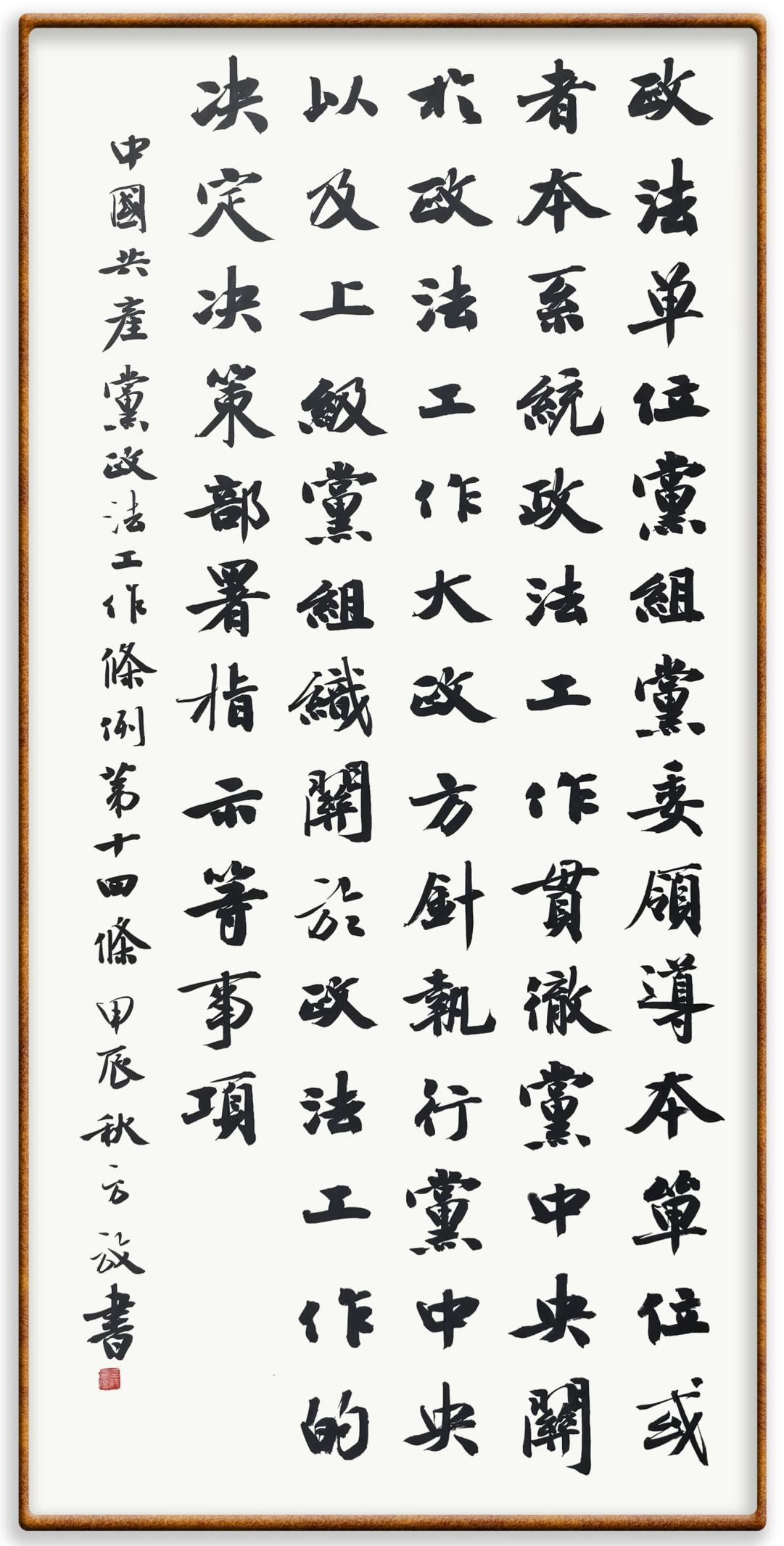 《中國共產(chǎn)黨政法工作條例》對黨領導新時代政法工作進行全面制度擘畫,為黨領導政法工作提供基本遵循,具有重大而深遠的意義。為學習好、宣傳好、貫徹好、實施好這部黨內法規(guī),繼《中華人民共和國民法典》《中華人民共和國憲法》《信訪工作條例》《中華人民共和國澳門特別行政區(qū)基本法》《中華人民共和國香港特別行政區(qū)基本法》等法律法規(guī)之后,“書·法”系列活動將筆端對準《中國共產(chǎn)黨政法工作條例》。