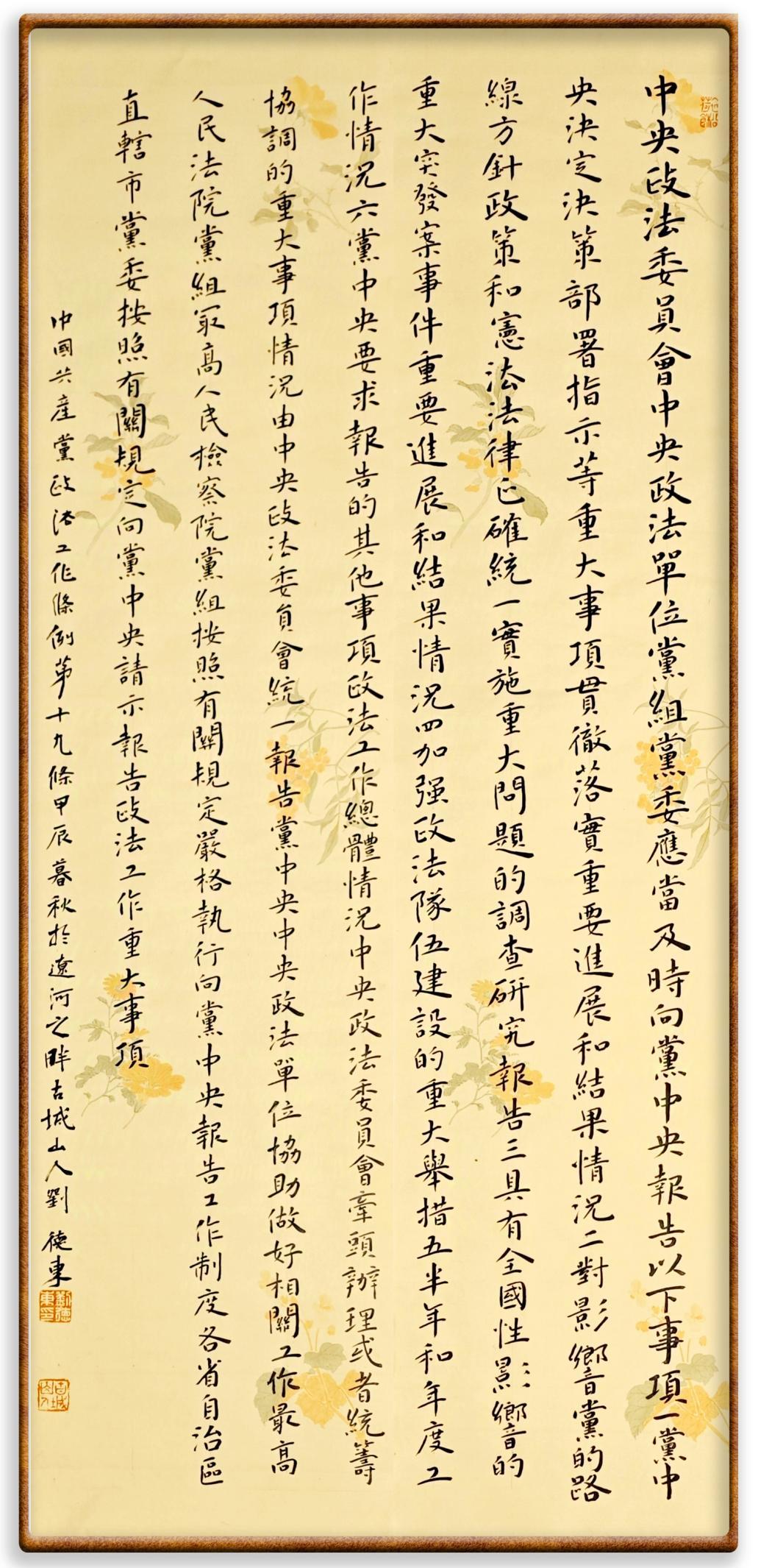 《中國共產(chǎn)黨政法工作條例》對(duì)黨領(lǐng)導(dǎo)新時(shí)代政法工作進(jìn)行全面制度擘畫,為黨領(lǐng)導(dǎo)政法工作提供基本遵循,具有重大而深遠(yuǎn)的意義。為學(xué)習(xí)好、宣傳好、貫徹好、實(shí)施好這部黨內(nèi)法規(guī),繼《中華人民共和國民法典》《中華人民共和國憲法》《信訪工作條例》《中華人民共和國澳門特別行政區(qū)基本法》《中華人民共和國香港特別行政區(qū)基本法》等法律法規(guī)之后,“書·法”系列活動(dòng)將筆端對(duì)準(zhǔn)《中國共產(chǎn)黨政法工作條例》。