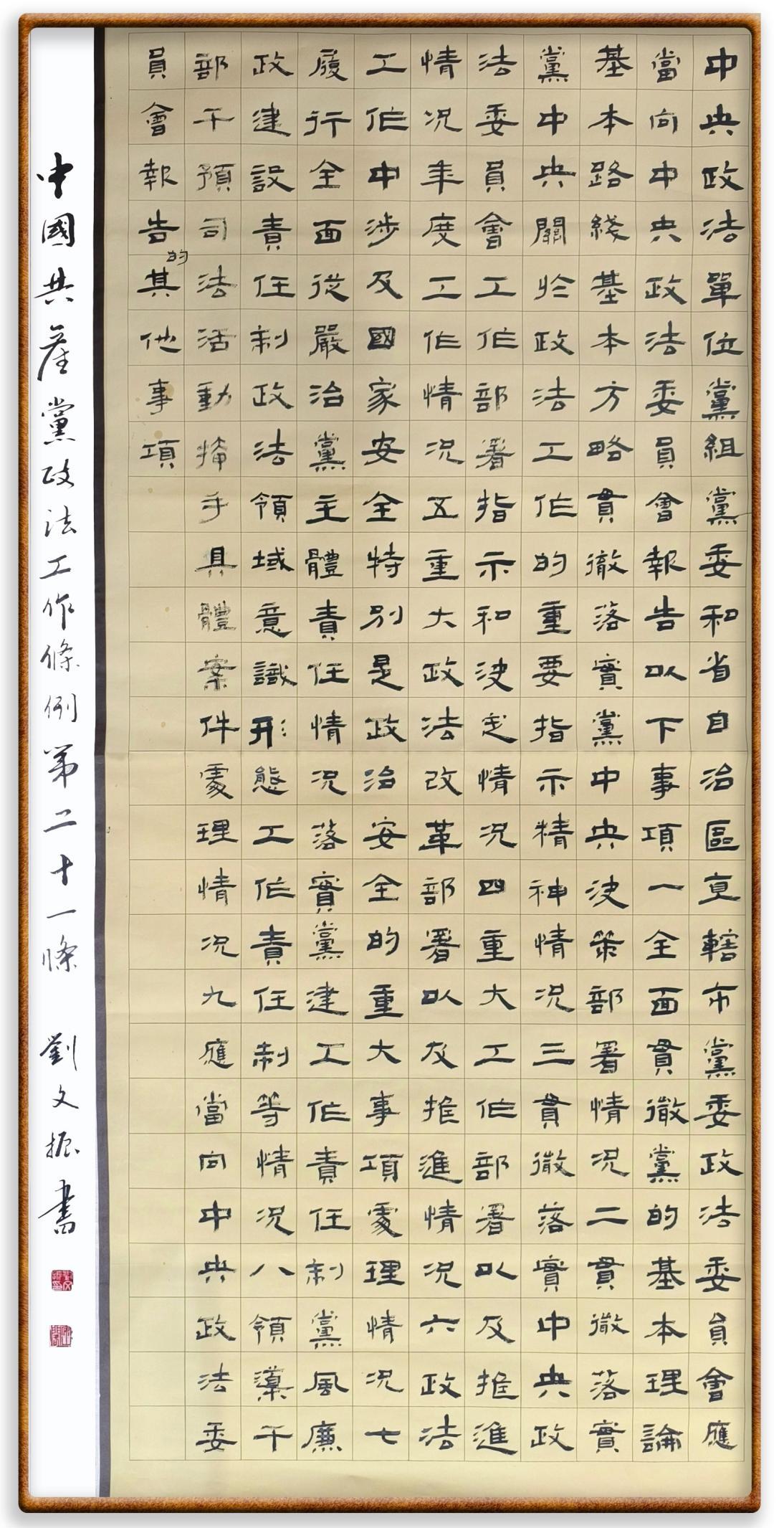《中國(guó)共產(chǎn)黨政法工作條例》對(duì)黨領(lǐng)導(dǎo)新時(shí)代政法工作進(jìn)行全面制度擘畫,為黨領(lǐng)導(dǎo)政法工作提供基本遵循,具有重大而深遠(yuǎn)的意義。為學(xué)習(xí)好、宣傳好、貫徹好、實(shí)施好這部黨內(nèi)法規(guī),繼《中華人民共和國(guó)民法典》《中華人民共和國(guó)憲法》《信訪工作條例》《中華人民共和國(guó)澳門特別行政區(qū)基本法》《中華人民共和國(guó)香港特別行政區(qū)基本法》等法律法規(guī)之后,“書·法”系列活動(dòng)將筆端對(duì)準(zhǔn)《中國(guó)共產(chǎn)黨政法工作條例》。