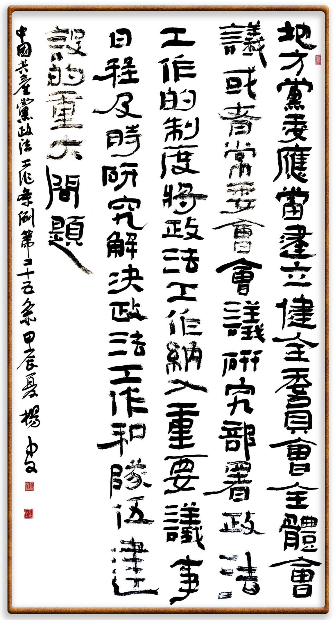 《中國共產(chǎn)黨政法工作條例》對黨領(lǐng)導(dǎo)新時代政法工作進行全面制度擘畫,為黨領(lǐng)導(dǎo)政法工作提供基本遵循,具有重大而深遠的意義。為學(xué)習好、宣傳好、貫徹好、實施好這部黨內(nèi)法規(guī),繼《中華人民共和國民法典》《中華人民共和國憲法》《信訪工作條例》《中華人民共和國澳門特別行政區(qū)基本法》《中華人民共和國香港特別行政區(qū)基本法》等法律法規(guī)之后,“書·法”系列活動將筆端對準《中國共產(chǎn)黨政法工作條例》。