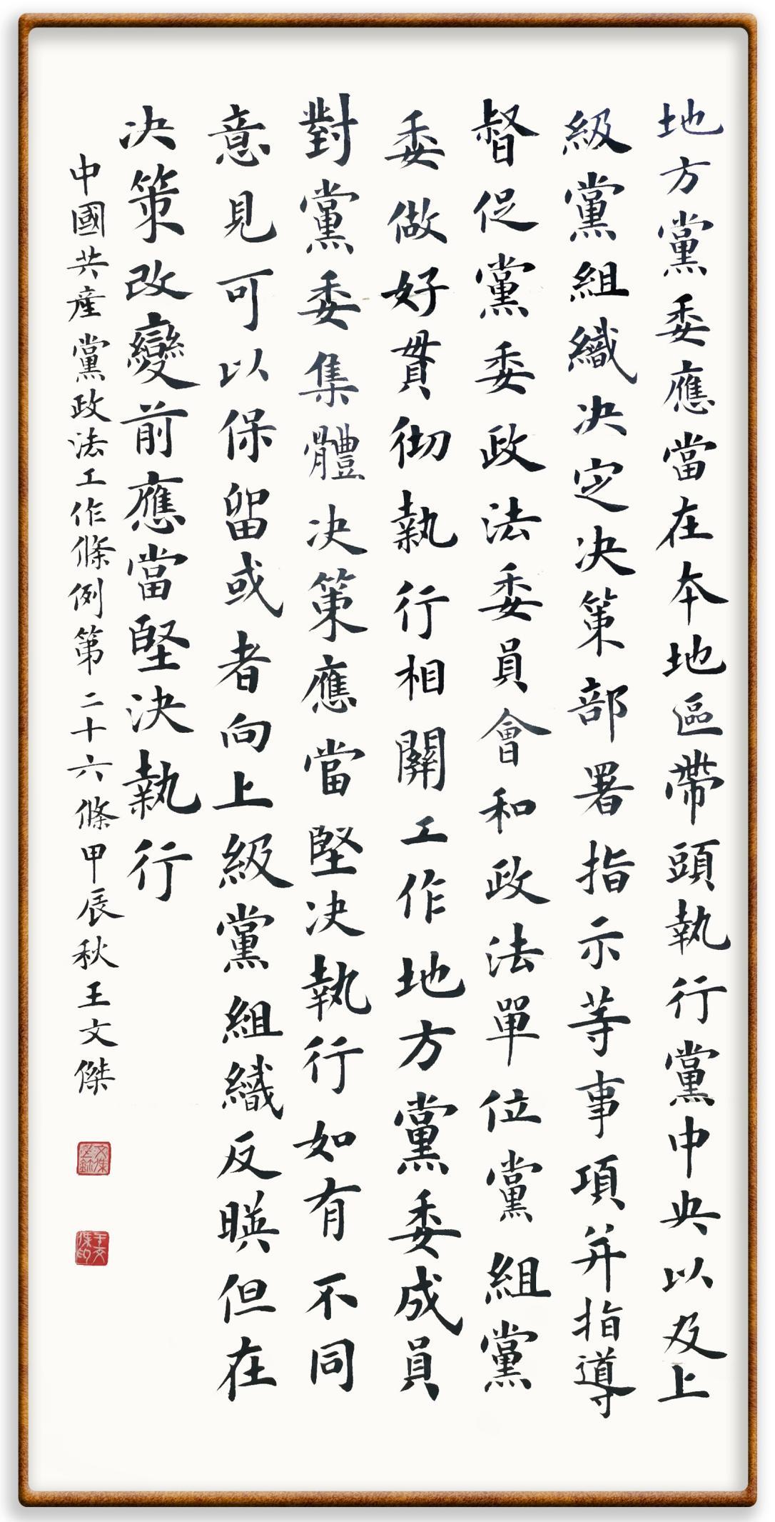 《中國共產(chǎn)黨政法工作條例》對黨領(lǐng)導(dǎo)新時(shí)代政法工作進(jìn)行全面制度擘畫,為黨領(lǐng)導(dǎo)政法工作提供基本遵循,具有重大而深遠(yuǎn)的意義。為學(xué)習(xí)好、宣傳好、貫徹好、實(shí)施好這部黨內(nèi)法規(guī),繼《中華人民共和國民法典》《中華人民共和國憲法》《信訪工作條例》《中華人民共和國澳門特別行政區(qū)基本法》《中華人民共和國香港特別行政區(qū)基本法》等法律法規(guī)之后,“書·法”系列活動(dòng)將筆端對準(zhǔn)《中國共產(chǎn)黨政法工作條例》。