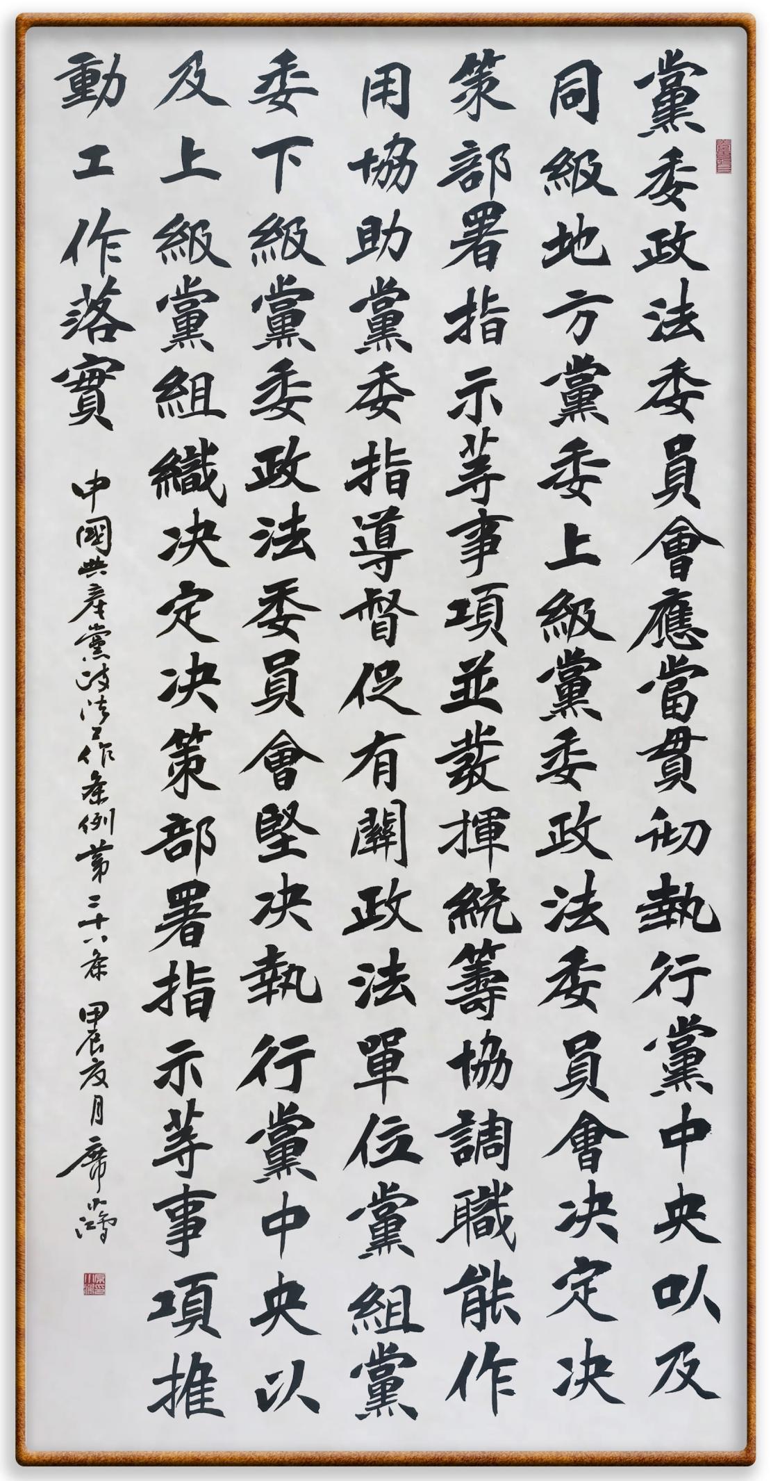 《中國共產(chǎn)黨政法工作條例》對(duì)黨領(lǐng)導(dǎo)新時(shí)代政法工作進(jìn)行全面制度擘畫,為黨領(lǐng)導(dǎo)政法工作提供基本遵循,具有重大而深遠(yuǎn)的意義。為學(xué)習(xí)好、宣傳好、貫徹好、實(shí)施好這部黨內(nèi)法規(guī),繼《中華人民共和國民法典》《中華人民共和國憲法》《信訪工作條例》《中華人民共和國澳門特別行政區(qū)基本法》《中華人民共和國香港特別行政區(qū)基本法》等法律法規(guī)之后,“書·法”系列活動(dòng)將筆端對(duì)準(zhǔn)《中國共產(chǎn)黨政法工作條例》。