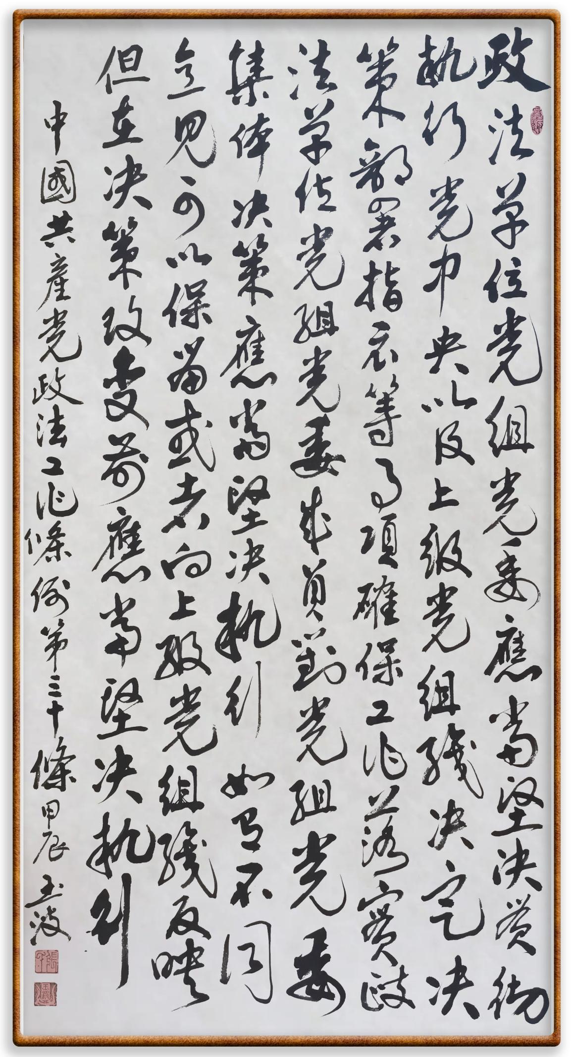 《中國共產(chǎn)黨政法工作條例》對黨領(lǐng)導(dǎo)新時(shí)代政法工作進(jìn)行全面制度擘畫,為黨領(lǐng)導(dǎo)政法工作提供基本遵循,具有重大而深遠(yuǎn)的意義。為學(xué)習(xí)好、宣傳好、貫徹好、實(shí)施好這部黨內(nèi)法規(guī),繼《中華人民共和國民法典》《中華人民共和國憲法》《信訪工作條例》《中華人民共和國澳門特別行政區(qū)基本法》《中華人民共和國香港特別行政區(qū)基本法》等法律法規(guī)之后,“書·法”系列活動將筆端對準(zhǔn)《中國共產(chǎn)黨政法工作條例》。