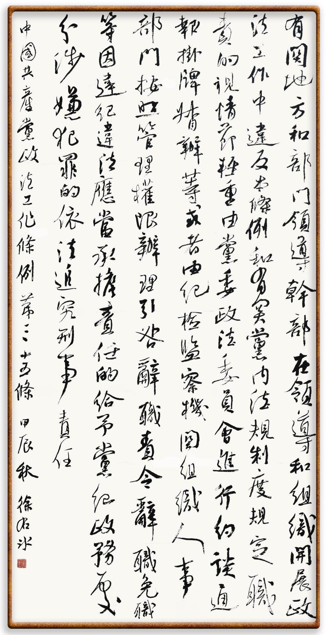 《中國(guó)共產(chǎn)黨政法工作條例》對(duì)黨領(lǐng)導(dǎo)新時(shí)代政法工作進(jìn)行全面制度擘畫,為黨領(lǐng)導(dǎo)政法工作提供基本遵循,具有重大而深遠(yuǎn)的意義。為學(xué)習(xí)好、宣傳好、貫徹好、實(shí)施好這部黨內(nèi)法規(guī),繼《中華人民共和國(guó)民法典》《中華人民共和國(guó)憲法》《信訪工作條例》《中華人民共和國(guó)澳門特別行政區(qū)基本法》《中華人民共和國(guó)香港特別行政區(qū)基本法》等法律法規(guī)之后,“書·法”系列活動(dòng)將筆端對(duì)準(zhǔn)《中國(guó)共產(chǎn)黨政法工作條例》。