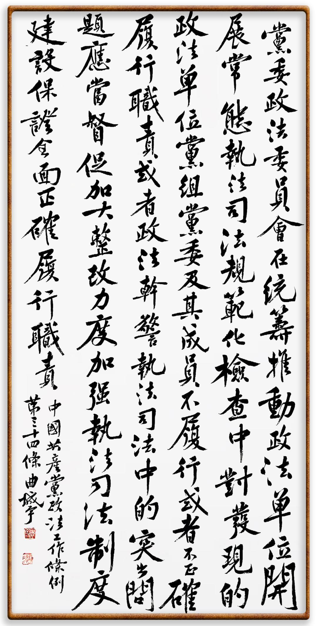 《中國共產(chǎn)黨政法工作條例》對黨領(lǐng)導(dǎo)新時代政法工作進(jìn)行全面制度擘畫,為黨領(lǐng)導(dǎo)政法工作提供基本遵循,具有重大而深遠(yuǎn)的意義。為學(xué)習(xí)好、宣傳好、貫徹好、實(shí)施好這部黨內(nèi)法規(guī),繼《中華人民共和國民法典》《中華人民共和國憲法》《信訪工作條例》《中華人民共和國澳門特別行政區(qū)基本法》《中華人民共和國香港特別行政區(qū)基本法》等法律法規(guī)之后,“書·法”系列活動將筆端對準(zhǔn)《中國共產(chǎn)黨政法工作條例》。