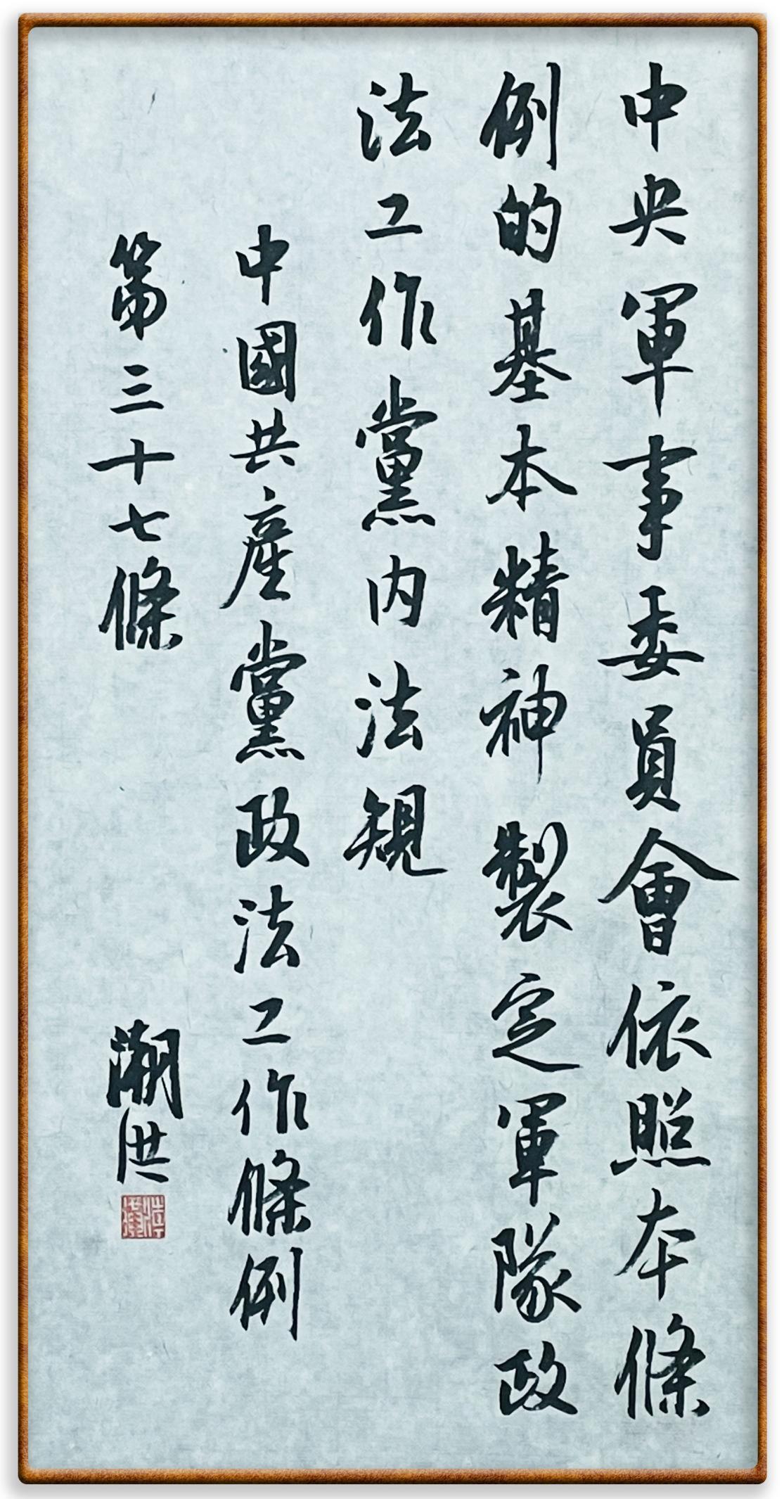 《中國共產(chǎn)黨政法工作條例》對黨領(lǐng)導(dǎo)新時代政法工作進(jìn)行全面制度擘畫,為黨領(lǐng)導(dǎo)政法工作提供基本遵循,具有重大而深遠(yuǎn)的意義。為學(xué)習(xí)好、宣傳好、貫徹好、實(shí)施好這部黨內(nèi)法規(guī),繼《中華人民共和國民法典》《中華人民共和國憲法》《信訪工作條例》《中華人民共和國澳門特別行政區(qū)基本法》《中華人民共和國香港特別行政區(qū)基本法》等法律法規(guī)之后,“書·法”系列活動將筆端對準(zhǔn)《中國共產(chǎn)黨政法工作條例》。