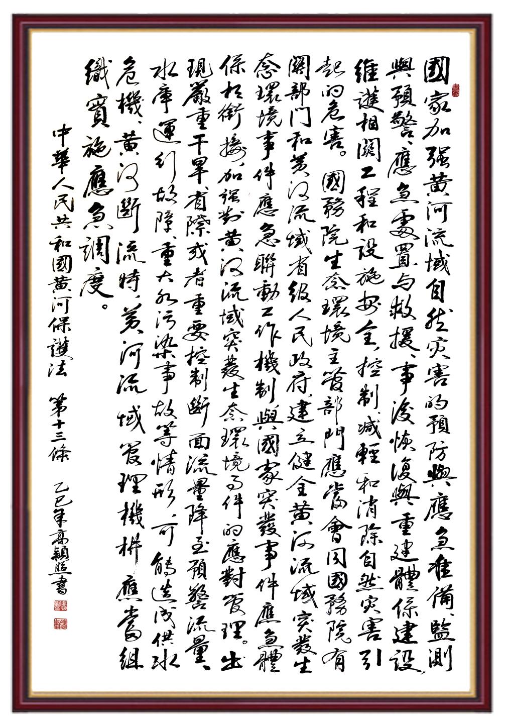 黃河寧,天下平。黃河是中華民族的發(fā)源地和搖籃,保護黃河是事關(guān)中華民族偉大復(fù)興的千秋大計?!吨腥A人民共和國黃河保護法》為推進水資源節(jié)約集約利用、保護傳承弘揚黃河文化、推動黃河流域生態(tài)保護和高質(zhì)量發(fā)展提供了有力法治保障。繼書寫《中華人民共和國民法典》《中華人民共和國憲法》《中華人民共和國澳門特別行政區(qū)基本法》《中華人民共和國香港特別行政區(qū)基本法》《中華人民共和國國旗法》《中華人民共和國國徽法》《中華人民共和國國歌法》《中華人民共和國法官法》等法律法規(guī)之后,法制日報社聯(lián)合沿黃九省(區(qū))司法廳、書法家協(xié)會,將筆端對準《中華人民共和國黃河保護法》。