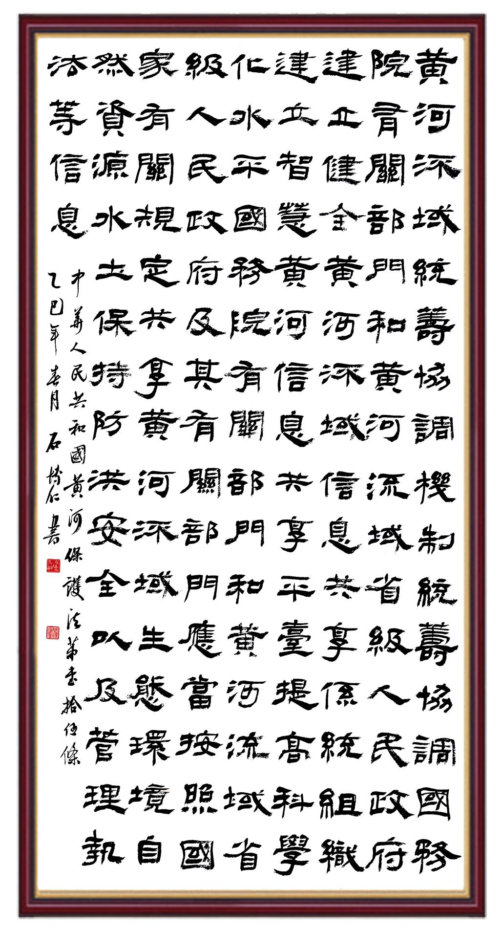 黃河寧,天下平。黃河是中華民族的發(fā)源地和搖籃,保護(hù)黃河是事關(guān)中華民族偉大復(fù)興的千秋大計?!吨腥A人民共和國黃河保護(hù)法》為推進(jìn)水資源節(jié)約集約利用、保護(hù)傳承弘揚(yáng)黃河文化、推動黃河流域生態(tài)保護(hù)和高質(zhì)量發(fā)展提供了有力法治保障。繼書寫《中華人民共和國民法典》《中華人民共和國憲法》《中華人民共和國澳門特別行政區(qū)基本法》《中華人民共和國香港特別行政區(qū)基本法》《中華人民共和國國旗法》《中華人民共和國國徽法》《中華人民共和國國歌法》《中華人民共和國法官法》等法律法規(guī)之后,法制日報社聯(lián)合沿黃九?。▍^(qū))司法廳、書法家協(xié)會,將筆端對準(zhǔn)《中華人民共和國黃河保護(hù)法》。