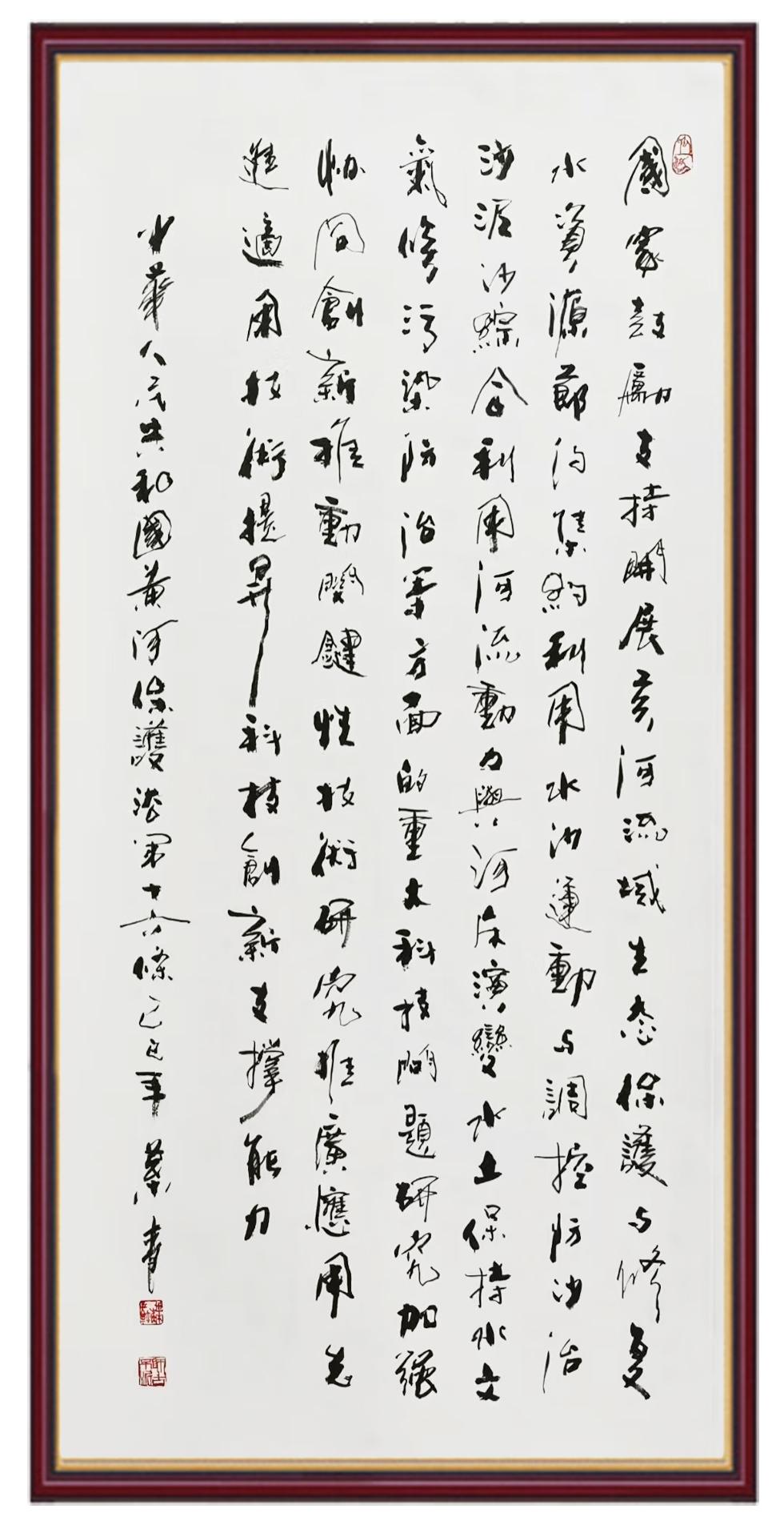 黃河寧,天下平。黃河是中華民族的發(fā)源地和搖籃,保護(hù)黃河是事關(guān)中華民族偉大復(fù)興的千秋大計(jì)。《中華人民共和國黃河保護(hù)法》為推進(jìn)水資源節(jié)約集約利用、保護(hù)傳承弘揚(yáng)黃河文化、推動(dòng)黃河流域生態(tài)保護(hù)和高質(zhì)量發(fā)展提供了有力法治保障。繼書寫《中華人民共和國民法典》《中華人民共和國憲法》《中華人民共和國澳門特別行政區(qū)基本法》《中華人民共和國香港特別行政區(qū)基本法》《中華人民共和國國旗法》《中華人民共和國國徽法》《中華人民共和國國歌法》《中華人民共和國法官法》等法律法規(guī)之后,法制日?qǐng)?bào)社聯(lián)合沿黃九省(區(qū))司法廳、書法家協(xié)會(huì),將筆端對(duì)準(zhǔn)《中華人民共和國黃河保護(hù)法》。