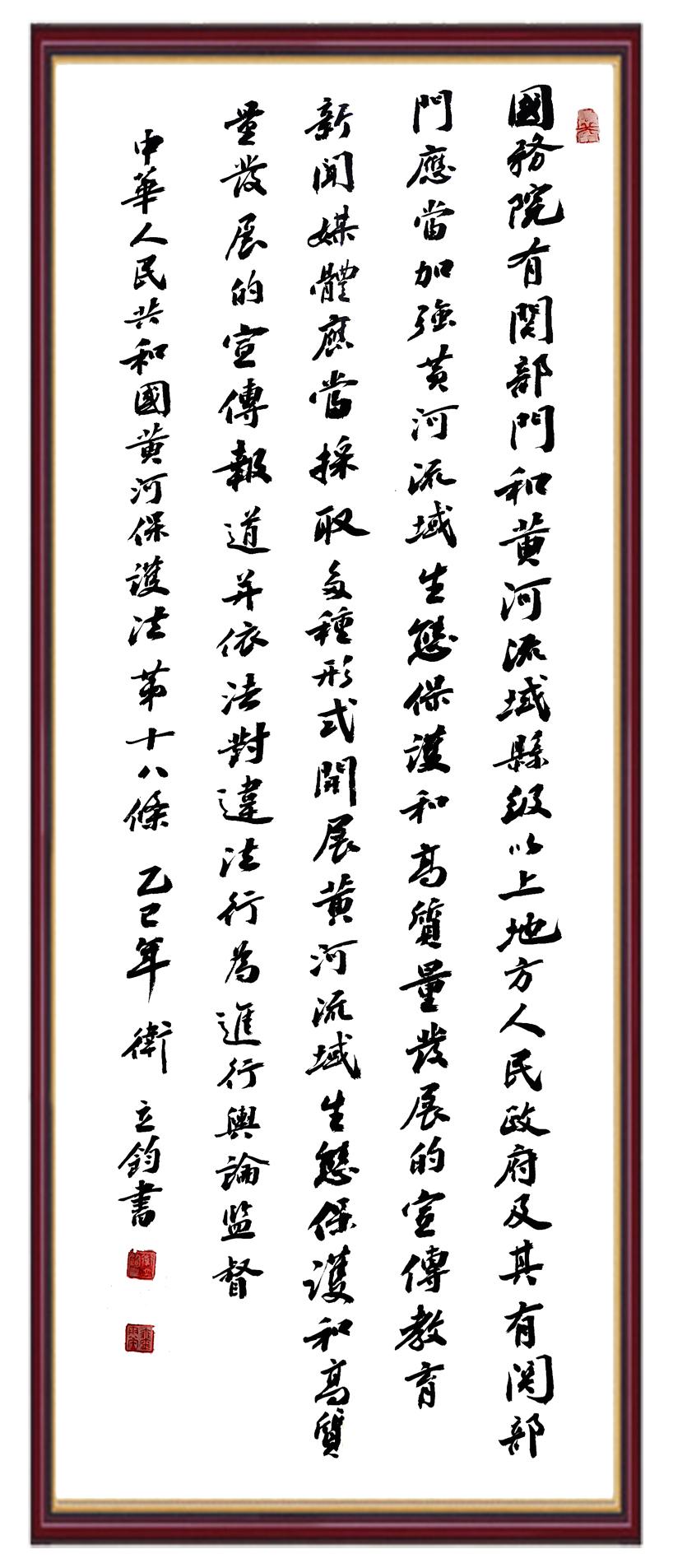 黃河寧,天下平。黃河是中華民族的發(fā)源地和搖籃,保護(hù)黃河是事關(guān)中華民族偉大復(fù)興的千秋大計?!吨腥A人民共和國黃河保護(hù)法》為推進(jìn)水資源節(jié)約集約利用、保護(hù)傳承弘揚(yáng)黃河文化、推動黃河流域生態(tài)保護(hù)和高質(zhì)量發(fā)展提供了有力法治保障。繼書寫《中華人民共和國民法典》《中華人民共和國憲法》《中華人民共和國澳門特別行政區(qū)基本法》《中華人民共和國香港特別行政區(qū)基本法》《中華人民共和國國旗法》《中華人民共和國國徽法》《中華人民共和國國歌法》《中華人民共和國法官法》等法律法規(guī)之后,法制日報社聯(lián)合沿黃九?。▍^(qū))司法廳、書法家協(xié)會,將筆端對準(zhǔn)《中華人民共和國黃河保護(hù)法》。