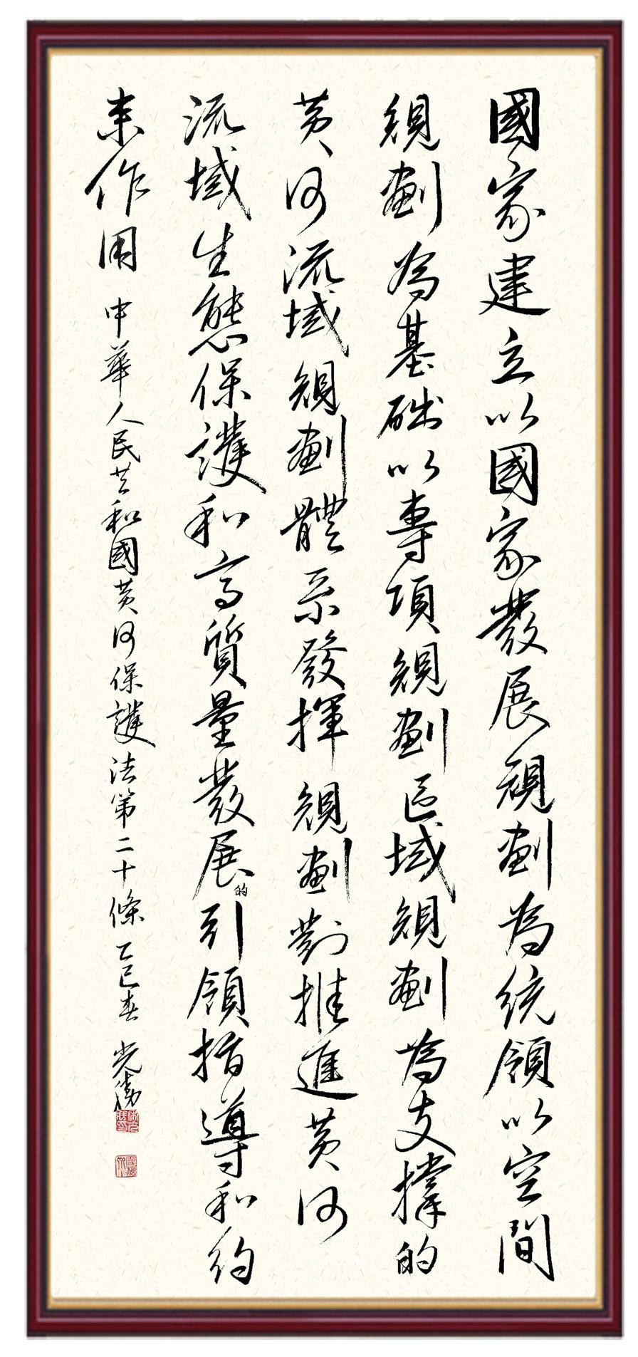 黃河寧,天下平。黃河是中華民族的發(fā)源地和搖籃,保護黃河是事關中華民族偉大復興的千秋大計。《中華人民共和國黃河保護法》為推進水資源節(jié)約集約利用、保護傳承弘揚黃河文化、推動黃河流域生態(tài)保護和高質量發(fā)展提供了有力法治保障。繼書寫《中華人民共和國民法典》《中華人民共和國憲法》《中華人民共和國澳門特別行政區(qū)基本法》《中華人民共和國香港特別行政區(qū)基本法》《中華人民共和國國旗法》《中華人民共和國國徽法》《中華人民共和國國歌法》《中華人民共和國法官法》等法律法規(guī)之后,法制日報社聯(lián)合沿黃九?。▍^(qū))司法廳、書法家協(xié)會,將筆端對準《中華人民共和國黃河保護法》。