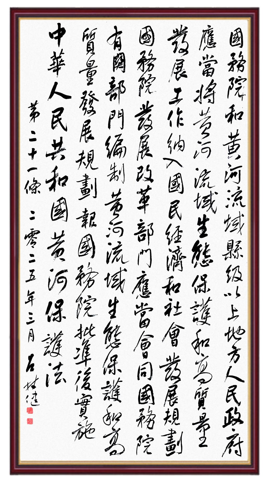 黃河寧,天下平。黃河是中華民族的發(fā)源地和搖籃,保護(hù)黃河是事關(guān)中華民族偉大復(fù)興的千秋大計?!吨腥A人民共和國黃河保護(hù)法》為推進(jìn)水資源節(jié)約集約利用、保護(hù)傳承弘揚黃河文化、推動黃河流域生態(tài)保護(hù)和高質(zhì)量發(fā)展提供了有力法治保障。繼書寫《中華人民共和國民法典》《中華人民共和國憲法》《中華人民共和國澳門特別行政區(qū)基本法》《中華人民共和國香港特別行政區(qū)基本法》《中華人民共和國國旗法》《中華人民共和國國徽法》《中華人民共和國國歌法》《中華人民共和國法官法》等法律法規(guī)之后,法制日報社聯(lián)合沿黃九?。▍^(qū))司法廳、書法家協(xié)會,將筆端對準(zhǔn)《中華人民共和國黃河保護(hù)法》。