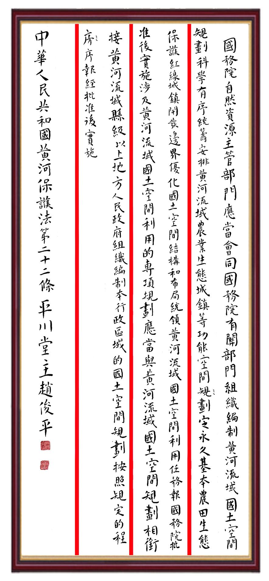 黃河寧,天下平。黃河是中華民族的發(fā)源地和搖籃,保護黃河是事關(guān)中華民族偉大復(fù)興的千秋大計。《中華人民共和國黃河保護法》為推進水資源節(jié)約集約利用、保護傳承弘揚黃河文化、推動黃河流域生態(tài)保護和高質(zhì)量發(fā)展提供了有力法治保障。繼書寫《中華人民共和國民法典》《中華人民共和國憲法》《中華人民共和國澳門特別行政區(qū)基本法》《中華人民共和國香港特別行政區(qū)基本法》《中華人民共和國國旗法》《中華人民共和國國徽法》《中華人民共和國國歌法》《中華人民共和國法官法》等法律法規(guī)之后,法制日報社聯(lián)合沿黃九?。▍^(qū))司法廳、書法家協(xié)會,將筆端對準(zhǔn)《中華人民共和國黃河保護法》。