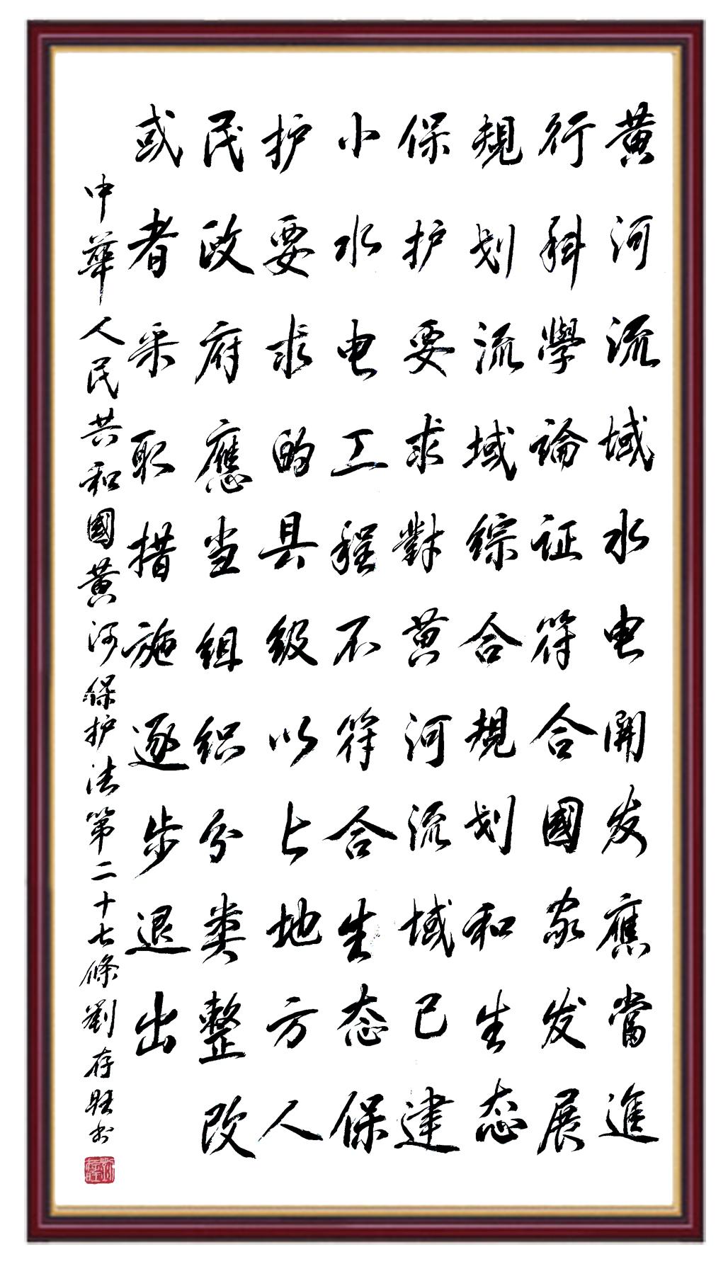 黃河寧,天下平。黃河是中華民族的發(fā)源地和搖籃,保護(hù)黃河是事關(guān)中華民族偉大復(fù)興的千秋大計(jì)。《中華人民共和國(guó)黃河保護(hù)法》為推進(jìn)水資源節(jié)約集約利用、保護(hù)傳承弘揚(yáng)黃河文化、推動(dòng)黃河流域生態(tài)保護(hù)和高質(zhì)量發(fā)展提供了有力法治保障。繼書(shū)寫(xiě)《中華人民共和國(guó)民法典》《中華人民共和國(guó)憲法》《中華人民共和國(guó)澳門(mén)特別行政區(qū)基本法》《中華人民共和國(guó)香港特別行政區(qū)基本法》《中華人民共和國(guó)國(guó)旗法》《中華人民共和國(guó)國(guó)徽法》《中華人民共和國(guó)國(guó)歌法》《中華人民共和國(guó)法官法》等法律法規(guī)之后,法制日?qǐng)?bào)社聯(lián)合沿黃九?。▍^(qū))司法廳、書(shū)法家協(xié)會(huì),將筆端對(duì)準(zhǔn)《中華人民共和國(guó)黃河保護(hù)法》。