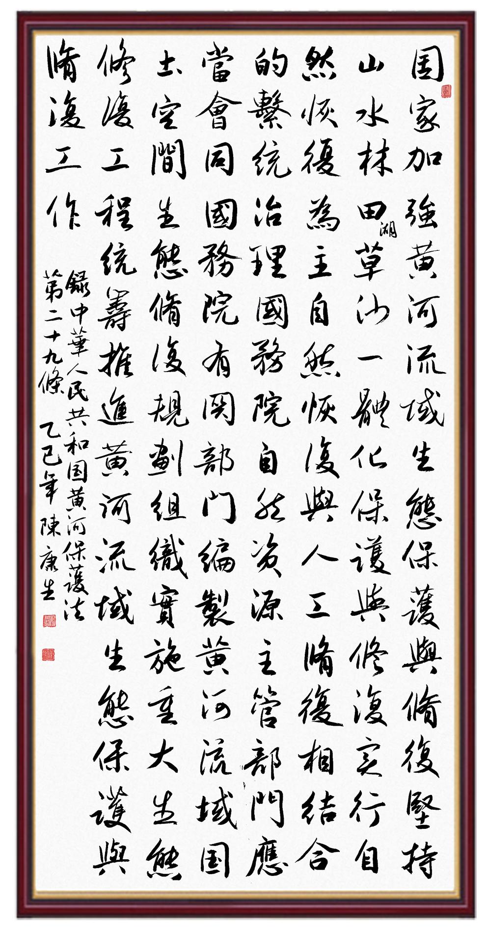 黃河寧,天下平。黃河是中華民族的發(fā)源地和搖籃,保護黃河是事關中華民族偉大復興的千秋大計。《中華人民共和國黃河保護法》為推進水資源節(jié)約集約利用、保護傳承弘揚黃河文化、推動黃河流域生態(tài)保護和高質(zhì)量發(fā)展提供了有力法治保障。繼書寫《中華人民共和國民法典》《中華人民共和國憲法》《中華人民共和國澳門特別行政區(qū)基本法》《中華人民共和國香港特別行政區(qū)基本法》《中華人民共和國國旗法》《中華人民共和國國徽法》《中華人民共和國國歌法》《中華人民共和國法官法》等法律法規(guī)之后,法制日報社聯(lián)合沿黃九?。▍^(qū))司法廳、書法家協(xié)會,將筆端對準《中華人民共和國黃河保護法》。