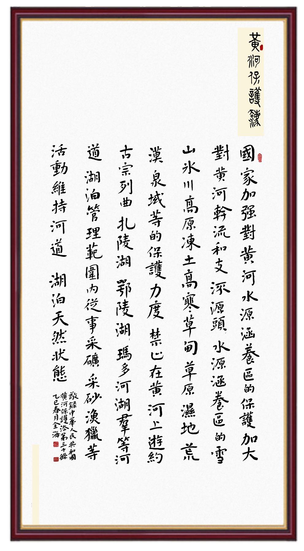 黃河寧,天下平。黃河是中華民族的發(fā)源地和搖籃,保護黃河是事關中華民族偉大復興的千秋大計?!吨腥A人民共和國黃河保護法》為推進水資源節(jié)約集約利用、保護傳承弘揚黃河文化、推動黃河流域生態(tài)保護和高質量發(fā)展提供了有力法治保障。繼書寫《中華人民共和國民法典》《中華人民共和國憲法》《中華人民共和國澳門特別行政區(qū)基本法》《中華人民共和國香港特別行政區(qū)基本法》《中華人民共和國國旗法》《中華人民共和國國徽法》《中華人民共和國國歌法》《中華人民共和國法官法》等法律法規(guī)之后,法制日報社聯合沿黃九?。▍^(qū))司法廳、書法家協會,將筆端對準《中華人民共和國黃河保護法》。