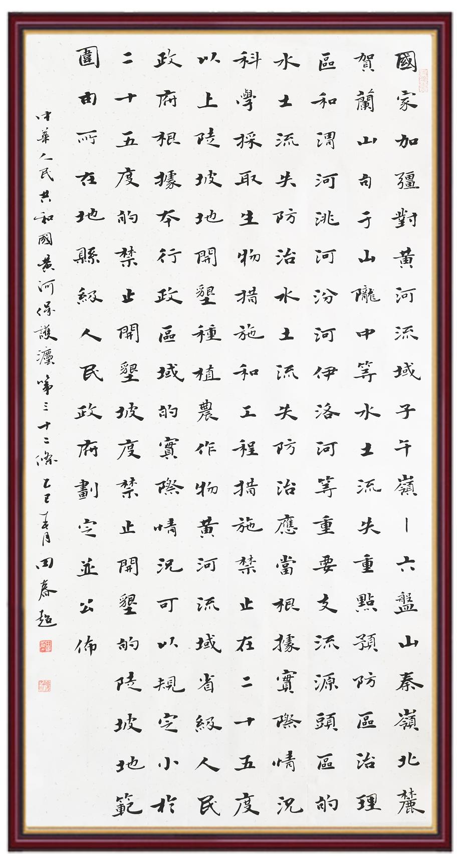 黃河寧,天下平。黃河是中華民族的發(fā)源地和搖籃,保護黃河是事關(guān)中華民族偉大復(fù)興的千秋大計。《中華人民共和國黃河保護法》為推進水資源節(jié)約集約利用、保護傳承弘揚黃河文化、推動黃河流域生態(tài)保護和高質(zhì)量發(fā)展提供了有力法治保障。繼書寫《中華人民共和國民法典》《中華人民共和國憲法》《中華人民共和國澳門特別行政區(qū)基本法》《中華人民共和國香港特別行政區(qū)基本法》《中華人民共和國國旗法》《中華人民共和國國徽法》《中華人民共和國國歌法》《中華人民共和國法官法》等法律法規(guī)之后,法制日報社聯(lián)合沿黃九?。▍^(qū))司法廳、書法家協(xié)會,將筆端對準《中華人民共和國黃河保護法》。