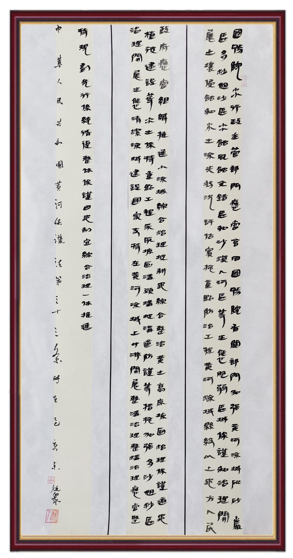 黃河寧,天下平。黃河是中華民族的發(fā)源地和搖籃,保護(hù)黃河是事關(guān)中華民族偉大復(fù)興的千秋大計。《中華人民共和國黃河保護(hù)法》為推進(jìn)水資源節(jié)約集約利用、保護(hù)傳承弘揚黃河文化、推動黃河流域生態(tài)保護(hù)和高質(zhì)量發(fā)展提供了有力法治保障。繼書寫《中華人民共和國民法典》《中華人民共和國憲法》《中華人民共和國澳門特別行政區(qū)基本法》《中華人民共和國香港特別行政區(qū)基本法》《中華人民共和國國旗法》《中華人民共和國國徽法》《中華人民共和國國歌法》《中華人民共和國法官法》等法律法規(guī)之后,法制日報社聯(lián)合沿黃九?。▍^(qū))司法廳、書法家協(xié)會,將筆端對準(zhǔn)《中華人民共和國黃河保護(hù)法》。