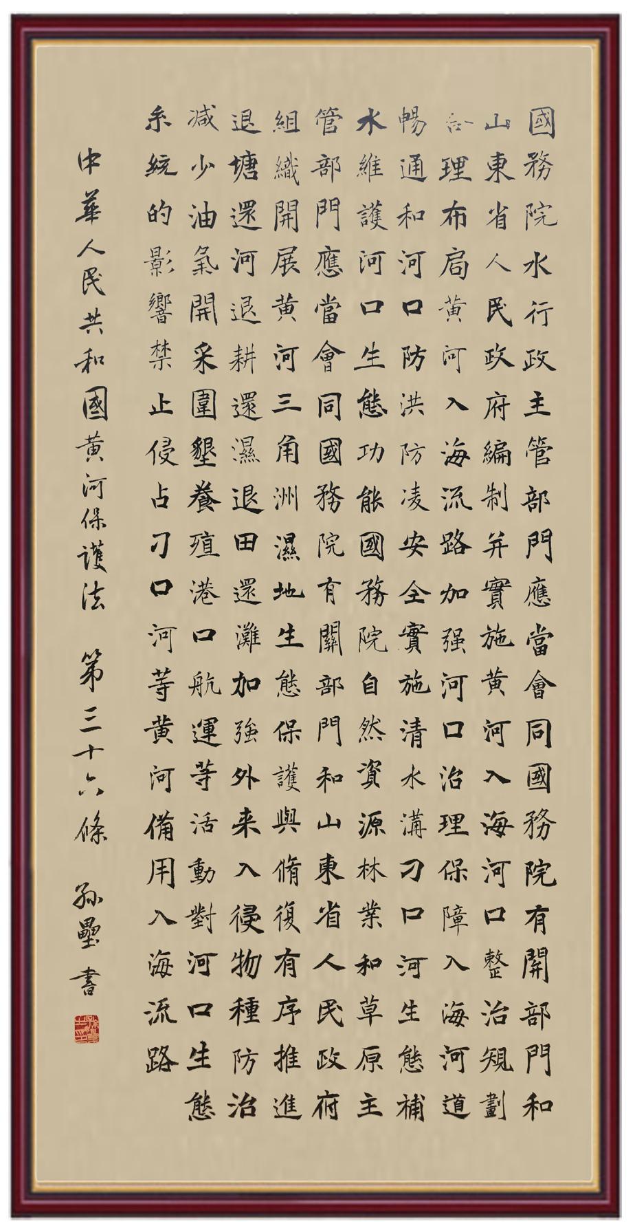 黃河寧,天下平。黃河是中華民族的發(fā)源地和搖籃,保護(hù)黃河是事關(guān)中華民族偉大復(fù)興的千秋大計(jì)?!吨腥A人民共和國黃河保護(hù)法》為推進(jìn)水資源節(jié)約集約利用、保護(hù)傳承弘揚(yáng)黃河文化、推動(dòng)黃河流域生態(tài)保護(hù)和高質(zhì)量發(fā)展提供了有力法治保障。繼書寫《中華人民共和國民法典》《中華人民共和國憲法》《中華人民共和國澳門特別行政區(qū)基本法》《中華人民共和國香港特別行政區(qū)基本法》《中華人民共和國國旗法》《中華人民共和國國徽法》《中華人民共和國國歌法》《中華人民共和國法官法》等法律法規(guī)之后,法制日報(bào)社聯(lián)合沿黃九?。▍^(qū))司法廳、書法家協(xié)會,將筆端對準(zhǔn)《中華人民共和國黃河保護(hù)法》。